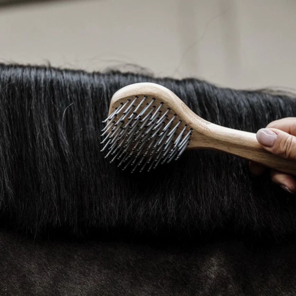 The handle of the Mane Brush is made from anti-bacterial and easy to clean rubberwood. The pins are polypropylene which is flexible enough not to damage the hair yet is strong enough to go through all the tangles.