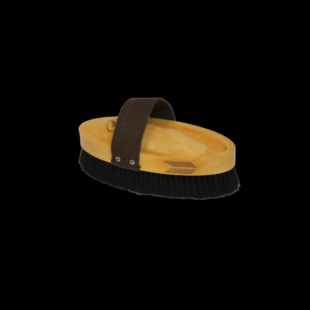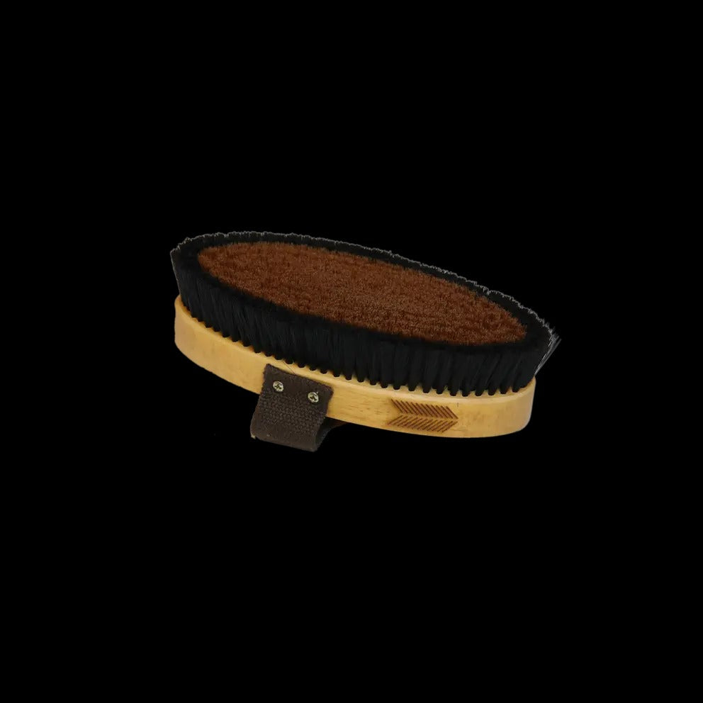 This varnished oval brush is filled with short hard nylon bristles to help distribute the oil of the coat and produce a shiny, glowing coat. The bristles in the center are smoother for better action. It is ideal to use in winter, on horses with a thicker coats. This brush has a cotton strap to hold your hand. Clean your brush by damping it into soapy warm water and make sure it lasts for a long time. Your horse will become the star of the stables thanks to this brush!
