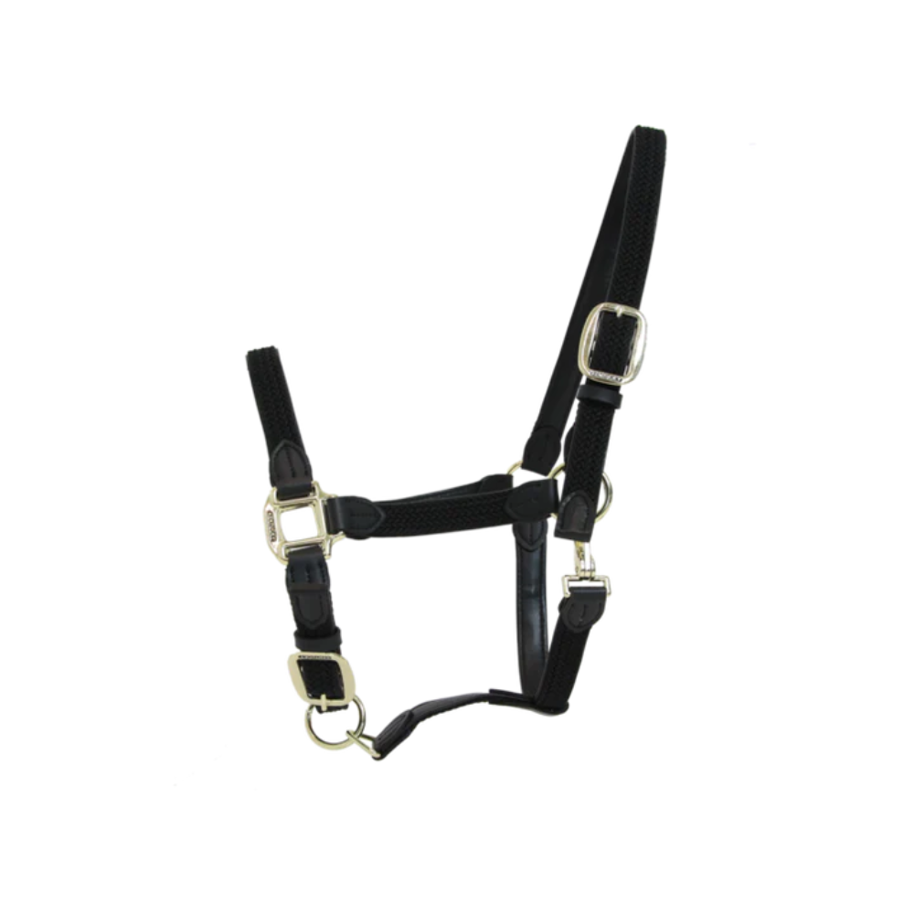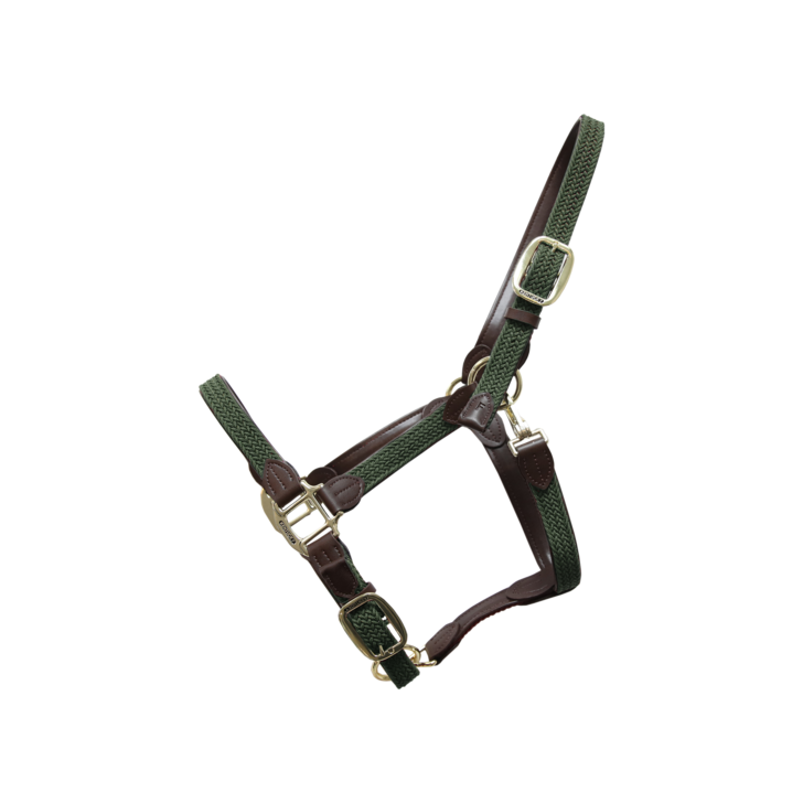 The Anatomic Leather Halter is made of artificial leather (100% animal friendly). This artificial leather does not absorb water or dirt, does not break or change color. It’s more flexible than real leather and therefore much nicer to use. Because it doesn’t absorb water, this halter is perfect for washing horses. The Anatomic Leather Halter is anatomically made and has a wider neck piece behind the ears. Therefore, the pressure is divided over a larger area. The nose piece is made of rolled artificial leather. The size can be adjusted on the left and right side of the head. The Anatomic Leather Halter features a gold colored plate with our engraved logo. It can be turned over and personalized. All closures are gold colored and are therefore a perfect match with our leads. The Anatomic Leather Halter can be cleaned with our Kentucky Horsewear Tack Cleaner. It was specially developed to clean our artificial leather. Very easy and efficient! Do not clean with glycerin soap.