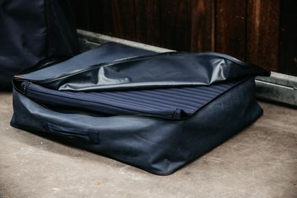 This elegant and practical Saddle Pad Bag is made out of heavy duty 600D polyester fabric with a waterproof coating and a nice finishing touch with artificial leather piping. It has been specially developed to store between 3 to 5 saddle pads. It is mainly used to store your pads after washing or during transport to keep them dry and clean. It’s your ideal stable mate at shows to keep your pads clean.