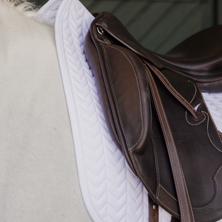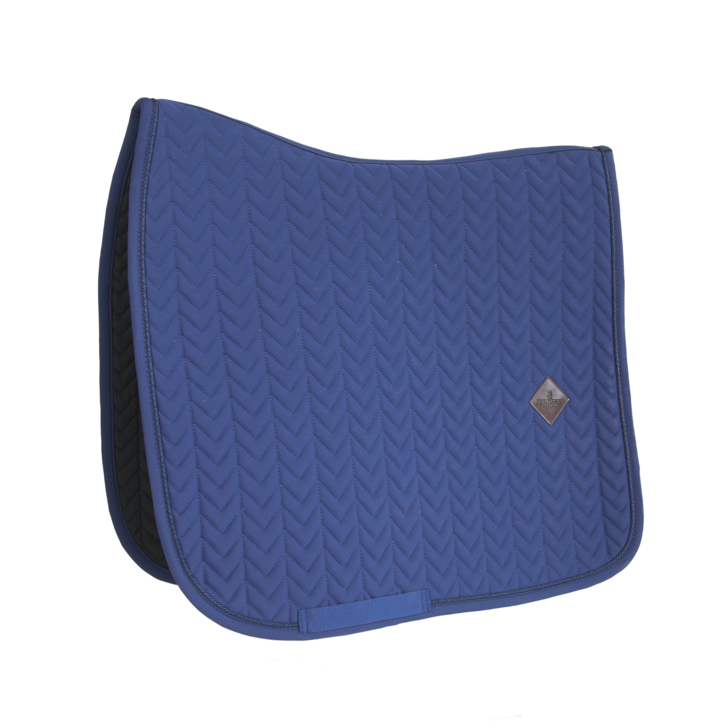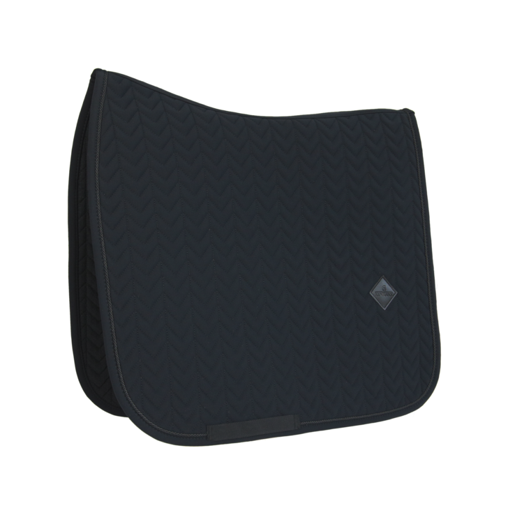 Our Saddle Pad Fishbone Dressage is shaped for dressage and provides excellent cushioning between the horse’s back and the saddle while protecting against friction. This saddle pad has a unique fishbone quilting and is made out of a breathable material (43% Nylon, 43% Polyester and 14% Spandex). The saddle pad has no annoying straps to attach to the saddle, only a nylon strap for the girth. This saddle pad has a subtle leather logo in the same color as the saddle pad, whilst still offering enough room to embroider it if needed. Machine washable at 30°, no dryer.