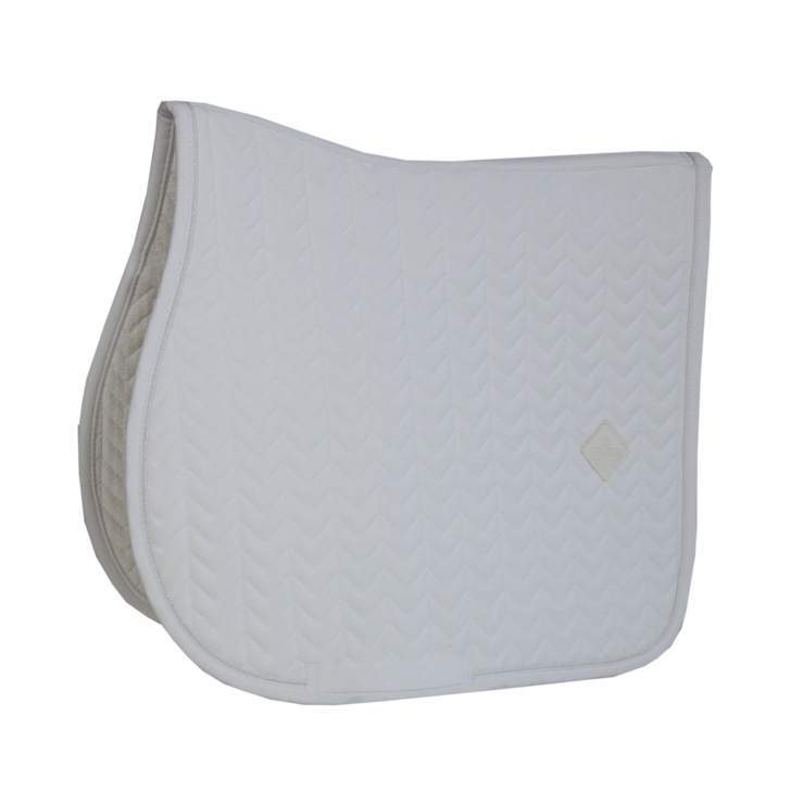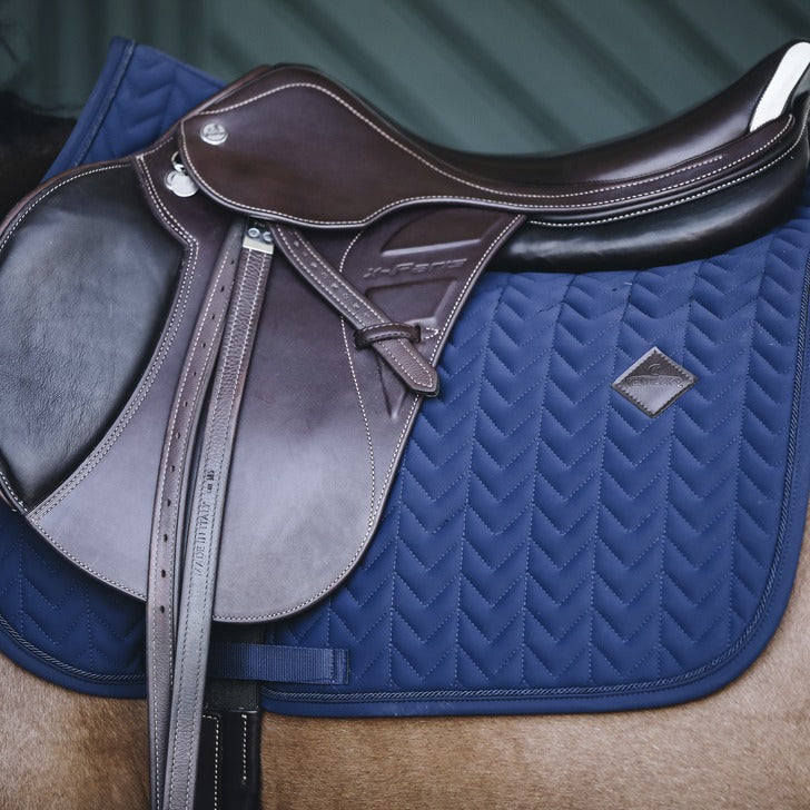 Our Saddle Pad Fishbone Jumping is shaped for jumping and provides excellent cushioning between the horse’s back and the saddle while protecting against friction. This saddle pad has a unique fishbone quilting and is made out of a breathable material (43% Nylon, 43% Polyester and 14% Spandex). The saddle pad has no annoying straps to attach to the saddle, only a nylon strap for the girth. This saddle pad has a subtle leather logo in the same color as the saddle pad, whilst still offering enough room to embroider it if needed. Machine washable at 30°, no dryer.