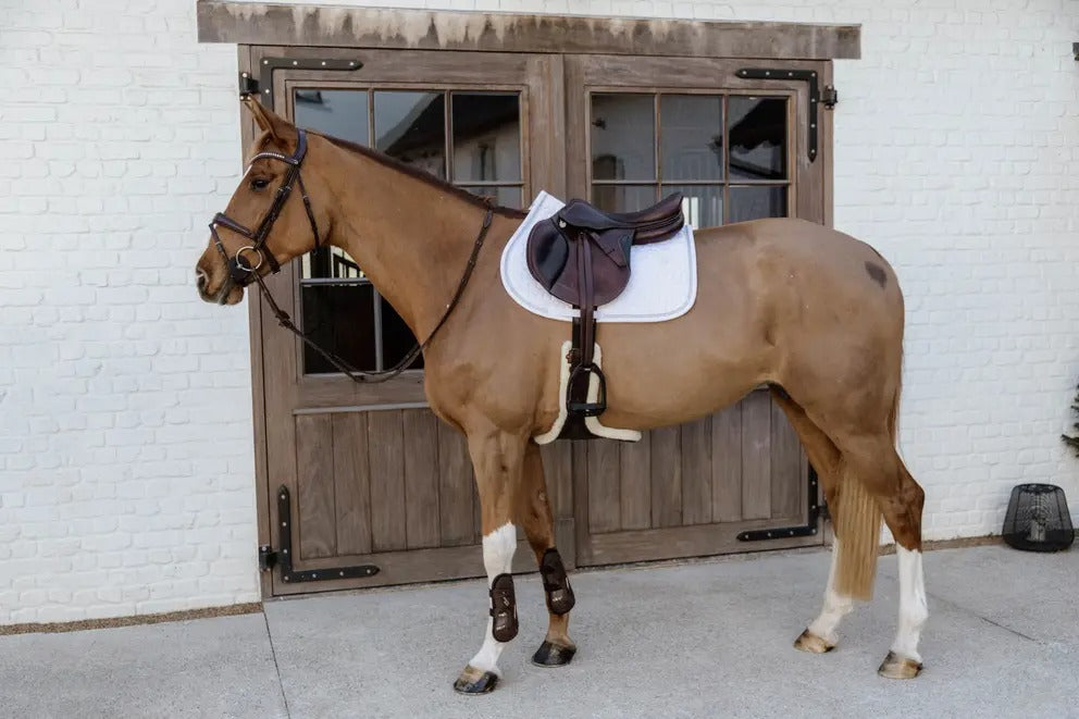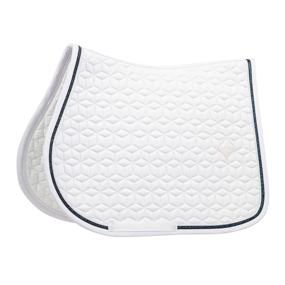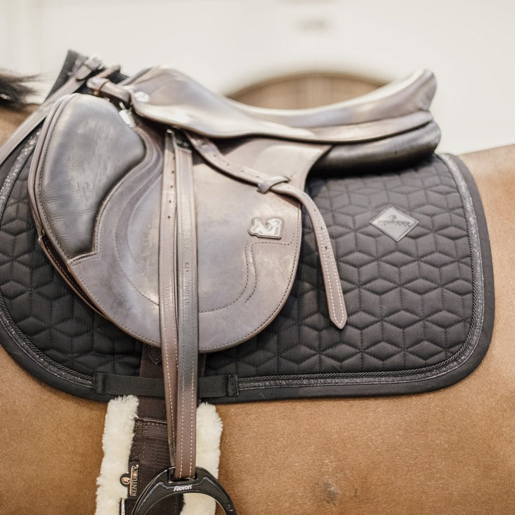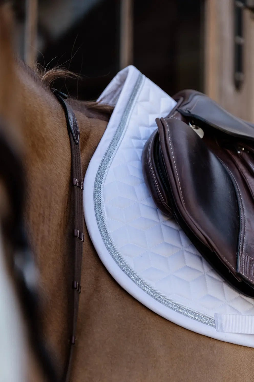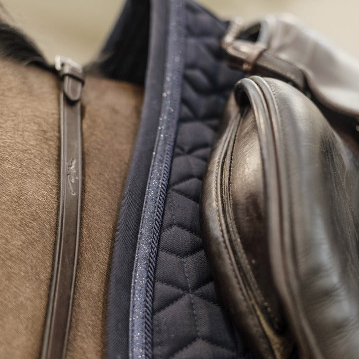 Our Saddle Pad Glitter Stone is shaped for jumping or dressage and provides excellent cushioning between the horse’s back and the saddle while protecting against friction. This saddle pad has a unique star quilting and features a stunning Glitter rope binding. It has no annoying straps to attach to the saddle, only a nylon strap for the girth. It is machine washable at 30°, no dryer.