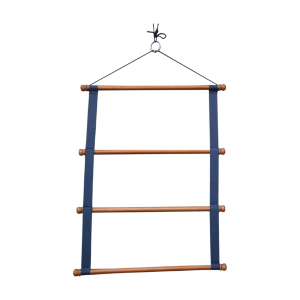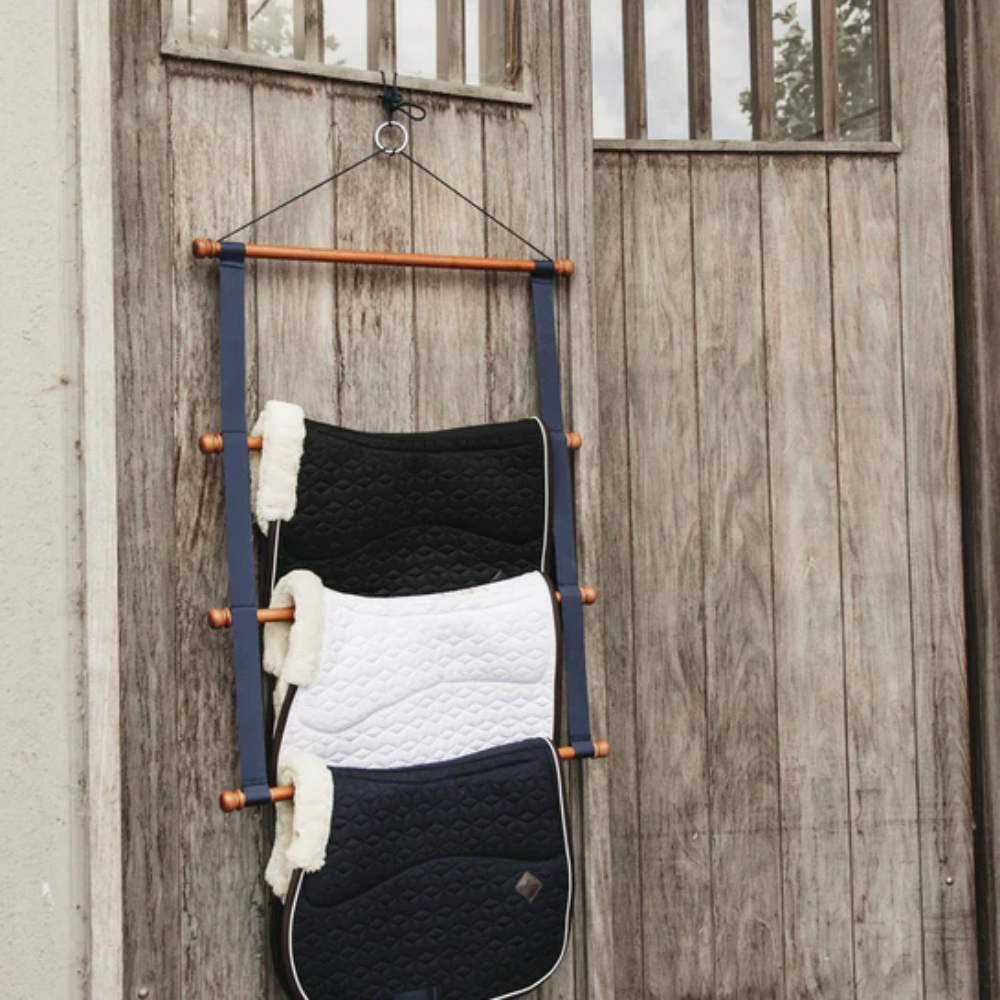 This Saddle Pad Holder Luxe will allow you to store your saddle pads in your tack room, ensuring their ventilation. An essential accessory for stables or on competitions, this Saddle pads holder is made of bamboo with a navy-blue fabric for a very chic look that will matches all our stable products. It can carry up to four saddle pads and is equipped with a loop and a cord to attach it wherever you want.