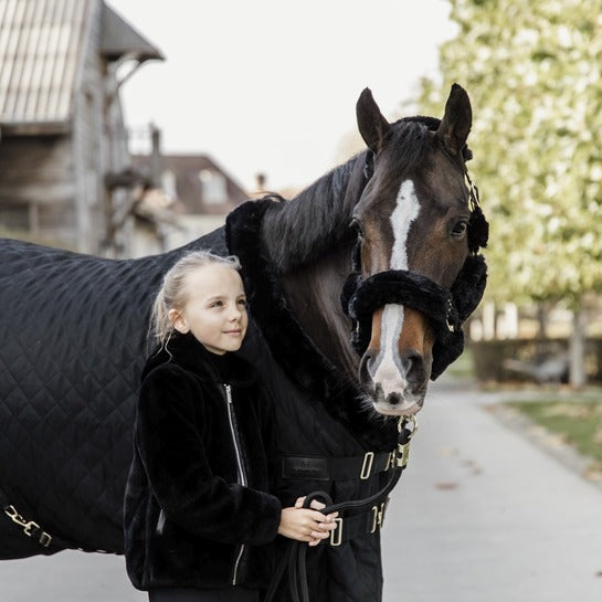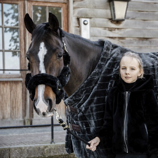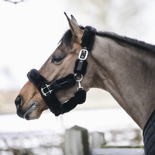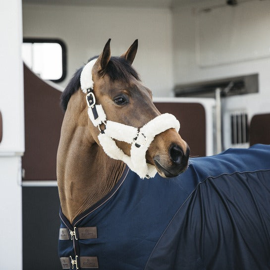 The Kentucky Horsewear Sheepskin Shipping Halter is an extremely soft and comfortable halter mainly used during transportation. The halter is made of very strong nylon in combination with our new artificial sheepskin which is attached directly onto the nylon. These materials make this halter very light. Its lightness reduces the pressure on the horse’s head and makes this halter the most efficient product on the market during long journeys. The artificial sheepskin (100% animal friendly) covers every inch, also the buckles, therefore the horses can’t be injured by the halter in any way. The size can be adjusted on both sides. A carabiner hook close to the cheek makes it easy to put on or take off the halter. This halter is machine washable at 30°, no tumble dryer.