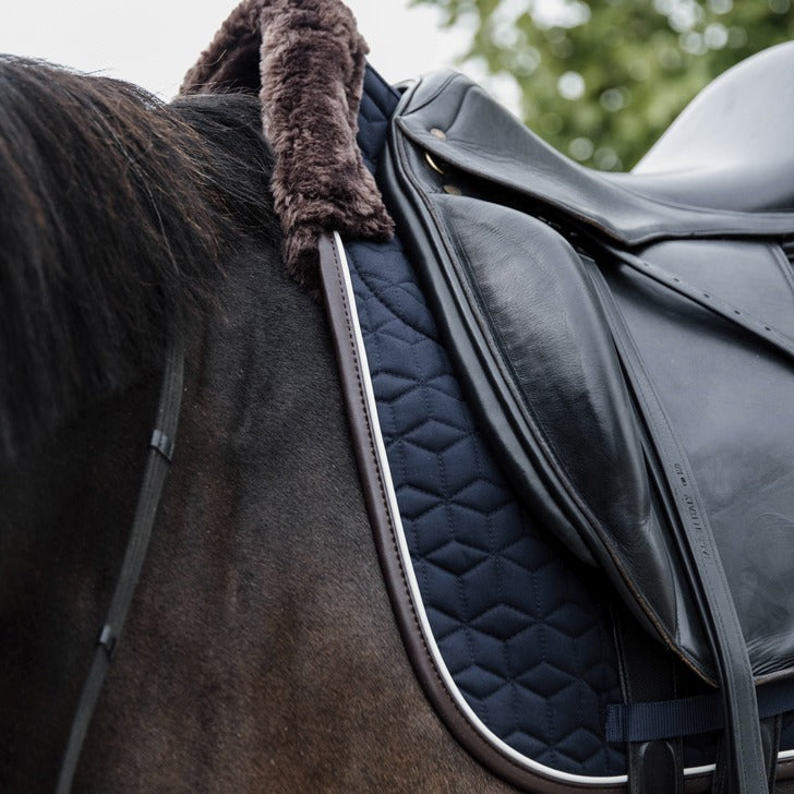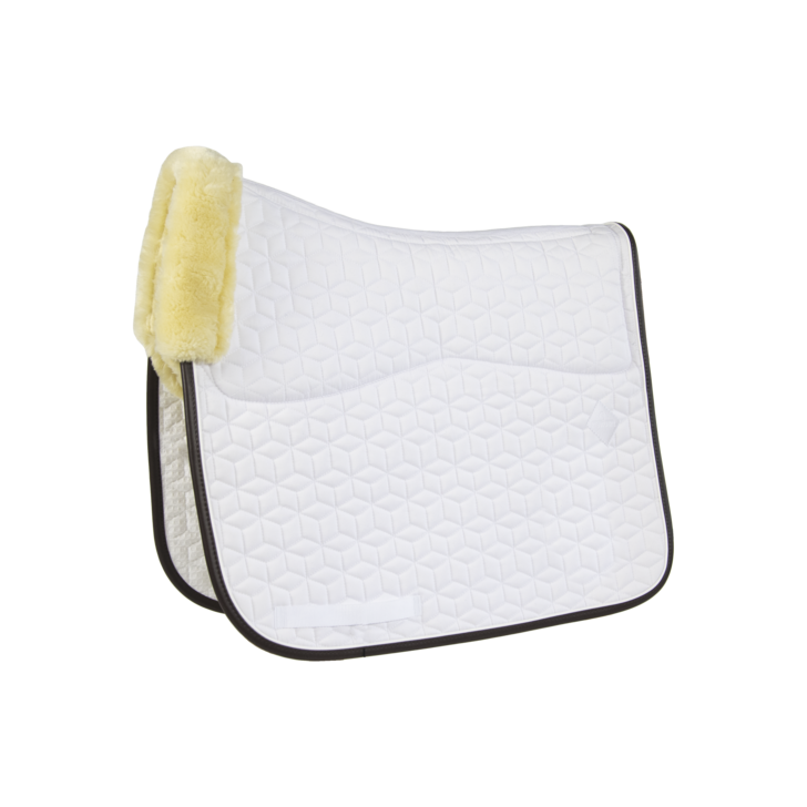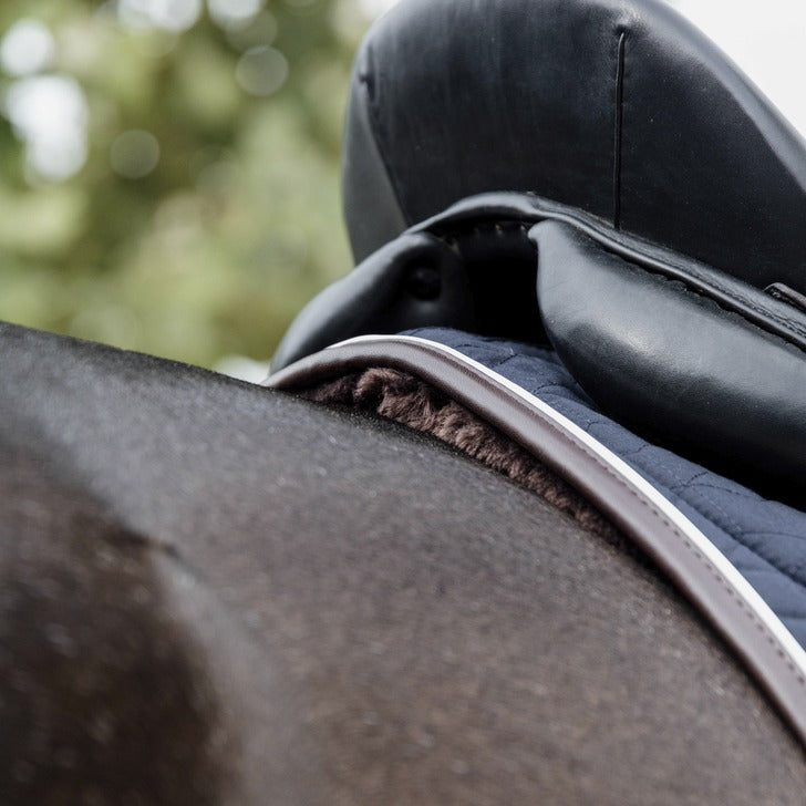 Our Skin Friendly Saddle Pad offers supreme cushioning between the horse’s back and the saddle while protecting against friction. Because of the artificial sheepskin on the inside of the saddle pad and on the withers, this Skin Friendly Saddle Pad offers nothing but comfort. It absorbs shocks and helps prevent friction between saddle(pad) andthe back of the horse. Therefore,this saddle pad is highly suitable for horses with sensitive skin. It makes a half pad unnecessary and offers a close contact with the horse.