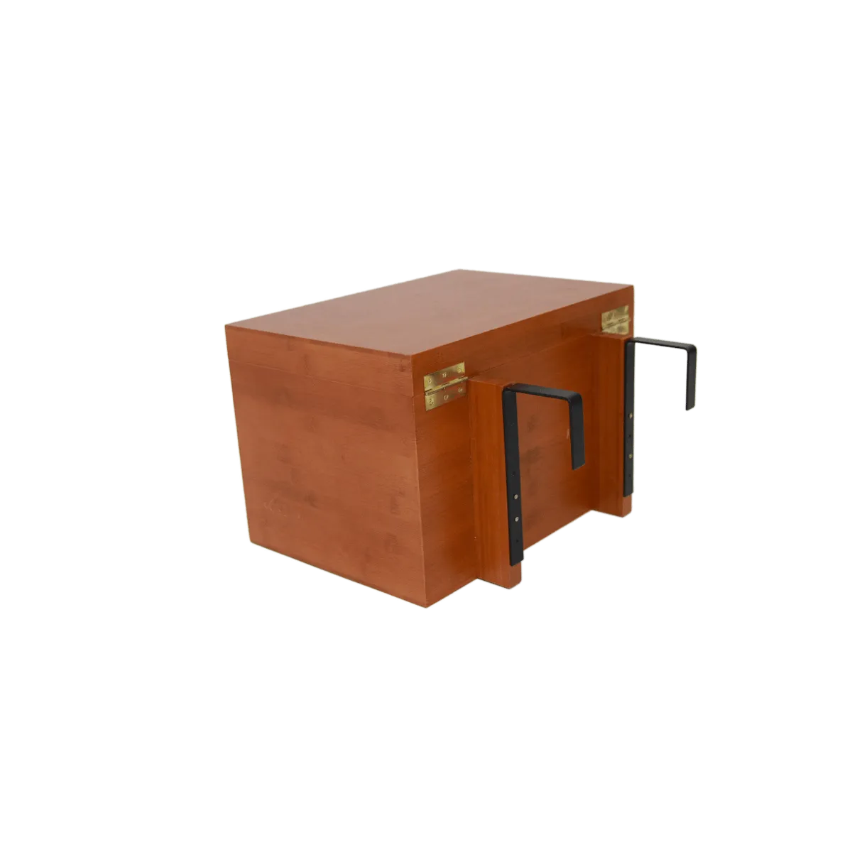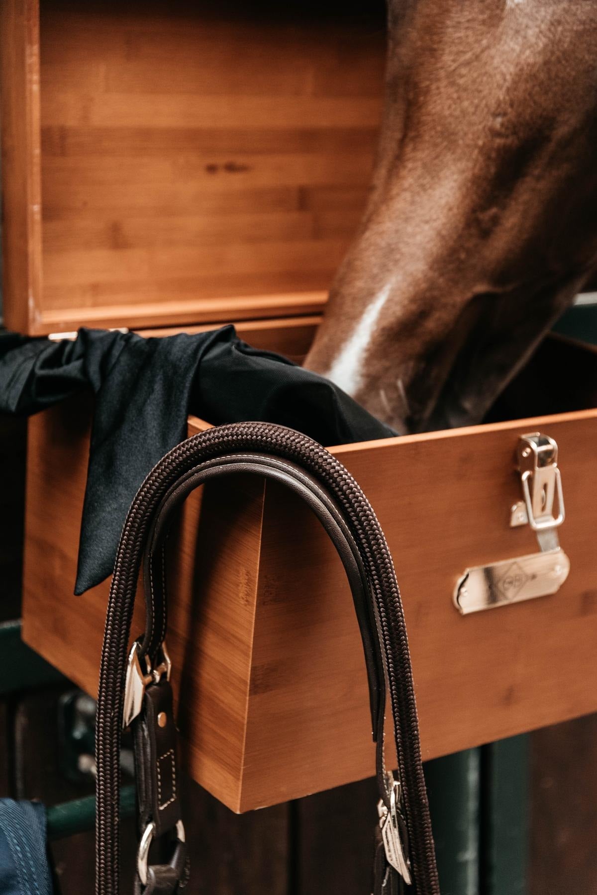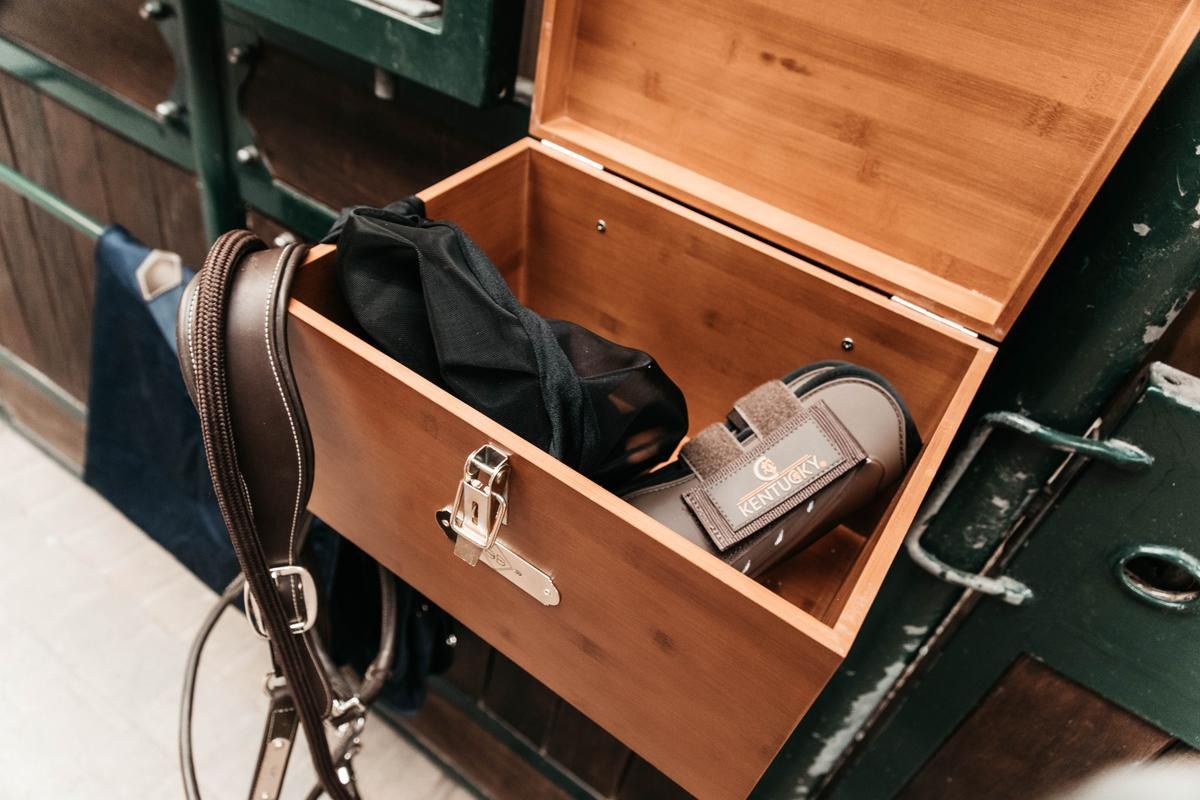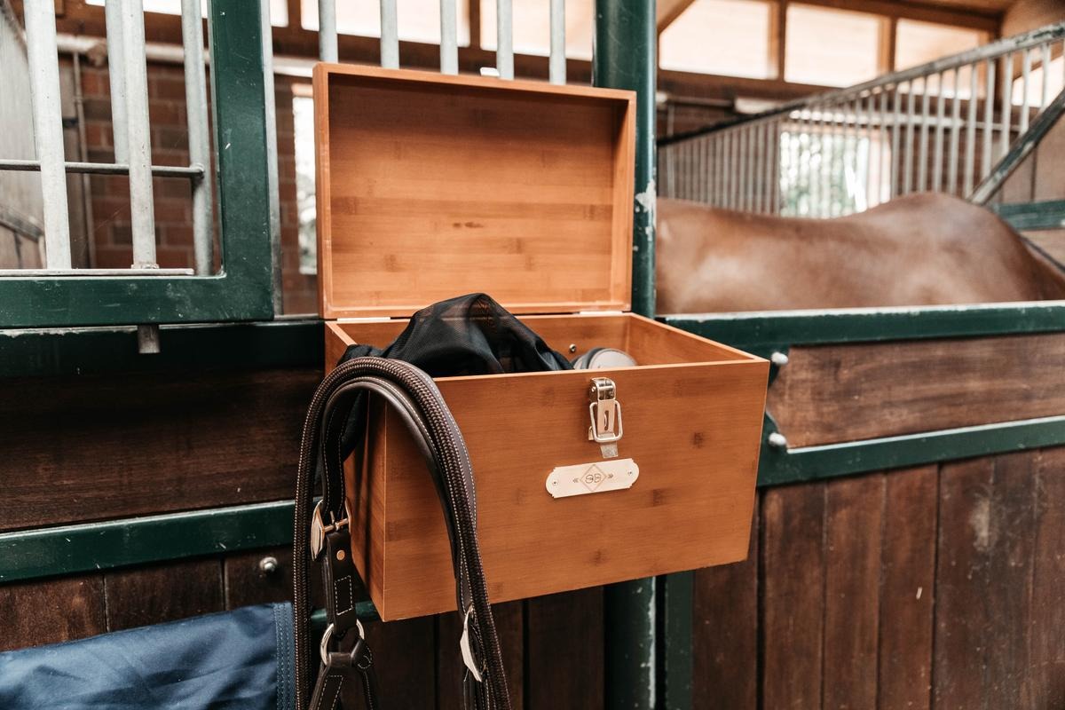 This Tack Box is ideal to store all your products and grooming equipment at shows or at home. It is 30cm high, 40cm wide and 28cm deep. The upper part opens and can be closed with two gold snap closures on which you can add a lock. Inside, you will find a big compartment (25x38x26 cm) which can be divided in two or three compartments thanks to 2 thin removable parts. You can organize the inside of your box your own way! It allows you to stock your spray bottles if needed. The box is made out of bamboo, which makes it extra resistant and super easy to clean. It is also very lightweight and comes with 3 gold handles so you can carry it everywhere. we do not recommend using the tack box as a stool.