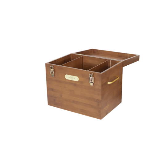 This Tack Box is ideal to store all your products and grooming equipment at shows or at home. It is 30cm high, 40cm wide and 28cm deep. The upper part opens and can be closed with two gold snap closures on which you can add a lock. Inside, you will find a big compartment (25x38x26 cm) which can be divided in two or three compartments thanks to 2 thin removable parts. You can organize the inside of your box your own way! It allows you to stock your spray bottles if needed. The box is made out of bamboo, which makes it extra resistant and super easy to clean. It is also very lightweight and comes with 3 gold handles so you can carry it everywhere. we do not recommend using the tack box as a stool.