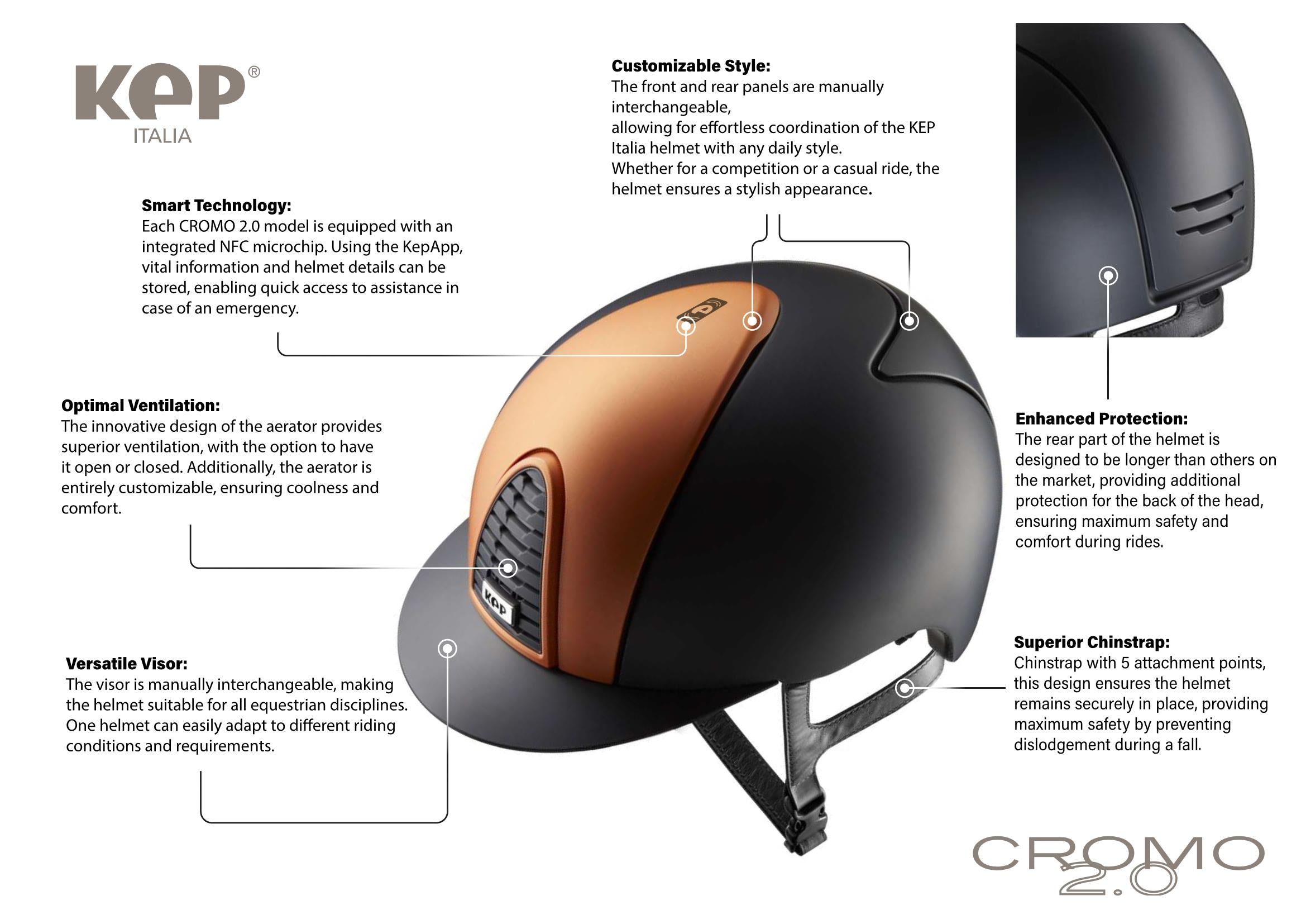 You can customize your unique helmet with gorgeous freehand airbrushing or other techniques. CROMO 2.0 is fitted with an integrated microchip, positioned under the front insert, to which you can upload the rider's health details using the KEP App. In case of need, this can help speed up the provision of first aid. Every helmet also comes with a jockey visor. Weight: 500 g size M - 535 g size L