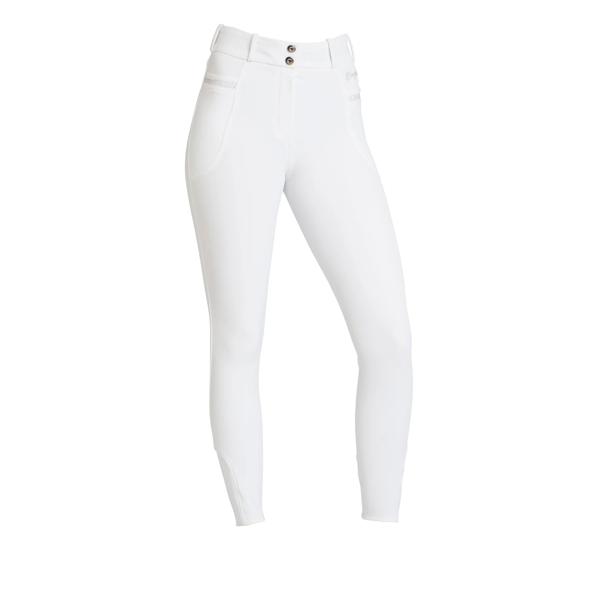 The KLkadi E-Tec Grip breeches come in both full and knee grip, and exude utter style and sophistication! This pair of high-waisted breeches was designed for the most active of riders, made from a powerful four-way stretch material that is both water and dust repellent, and with a handy phone pocket, to ensure that you can keep your phone on you at all times. The side panels and welt pockets feature crystal details, and the Kingsland logo is embroidered on both the side and back. Made out of 93% Nylon and 7% Elastane. Available in White, Kingsland Navy, Grey Sleet, and Beige Cinder.