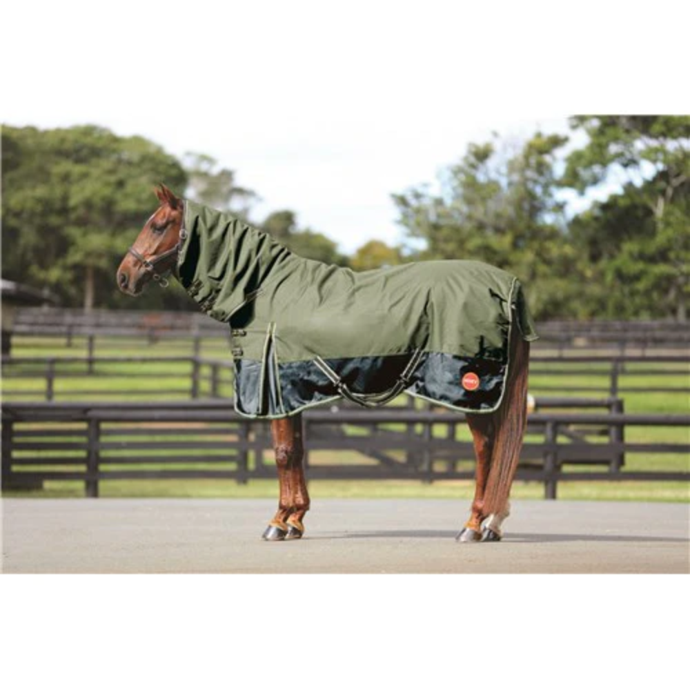 1200 Denier seamless ripstop outer, waterproof, breathable, 200g polyfill, quilted satin lining includes chest and shoulders, double chest straps, shoulder gusset, crossover surcingles, folded rump darts, tent tail flap, removable leg straps, combo neck.