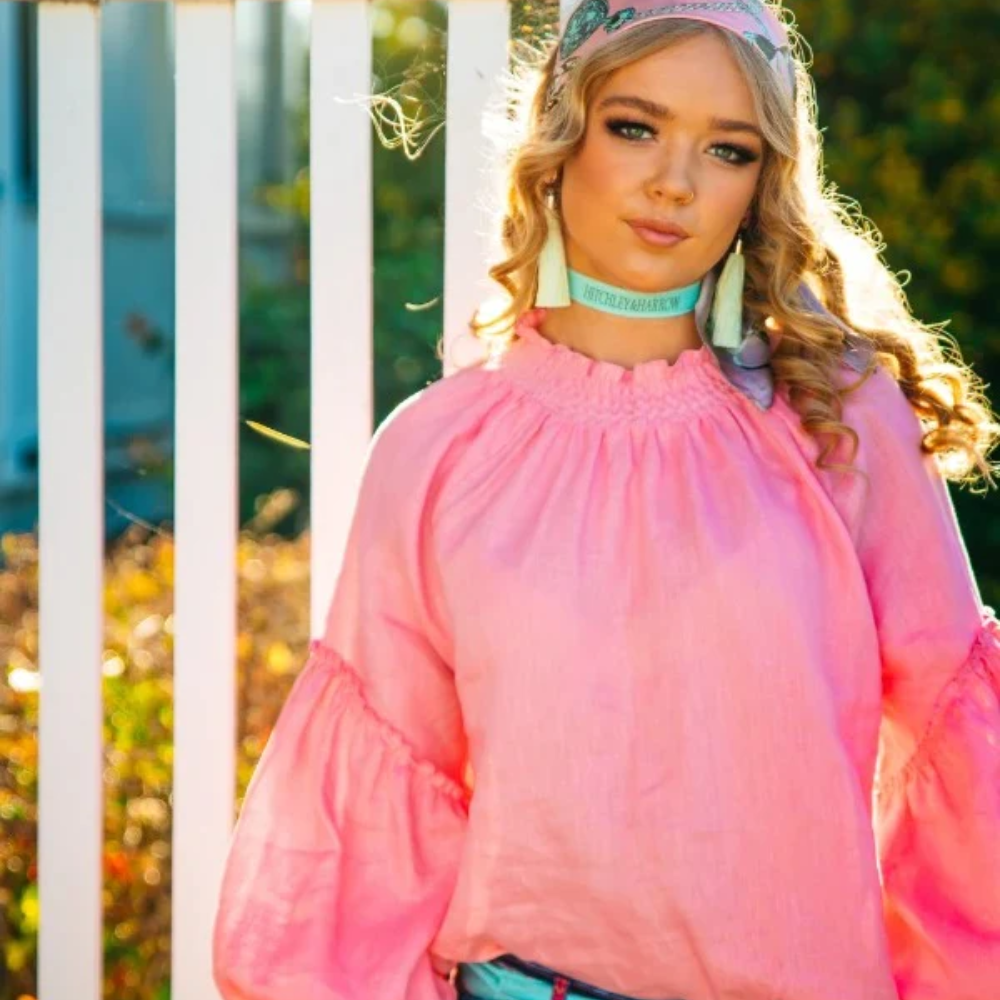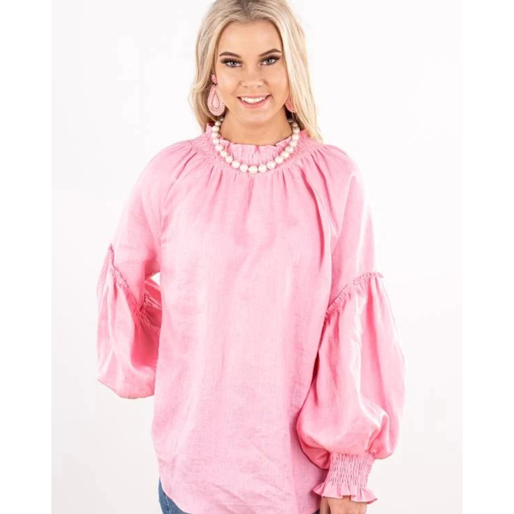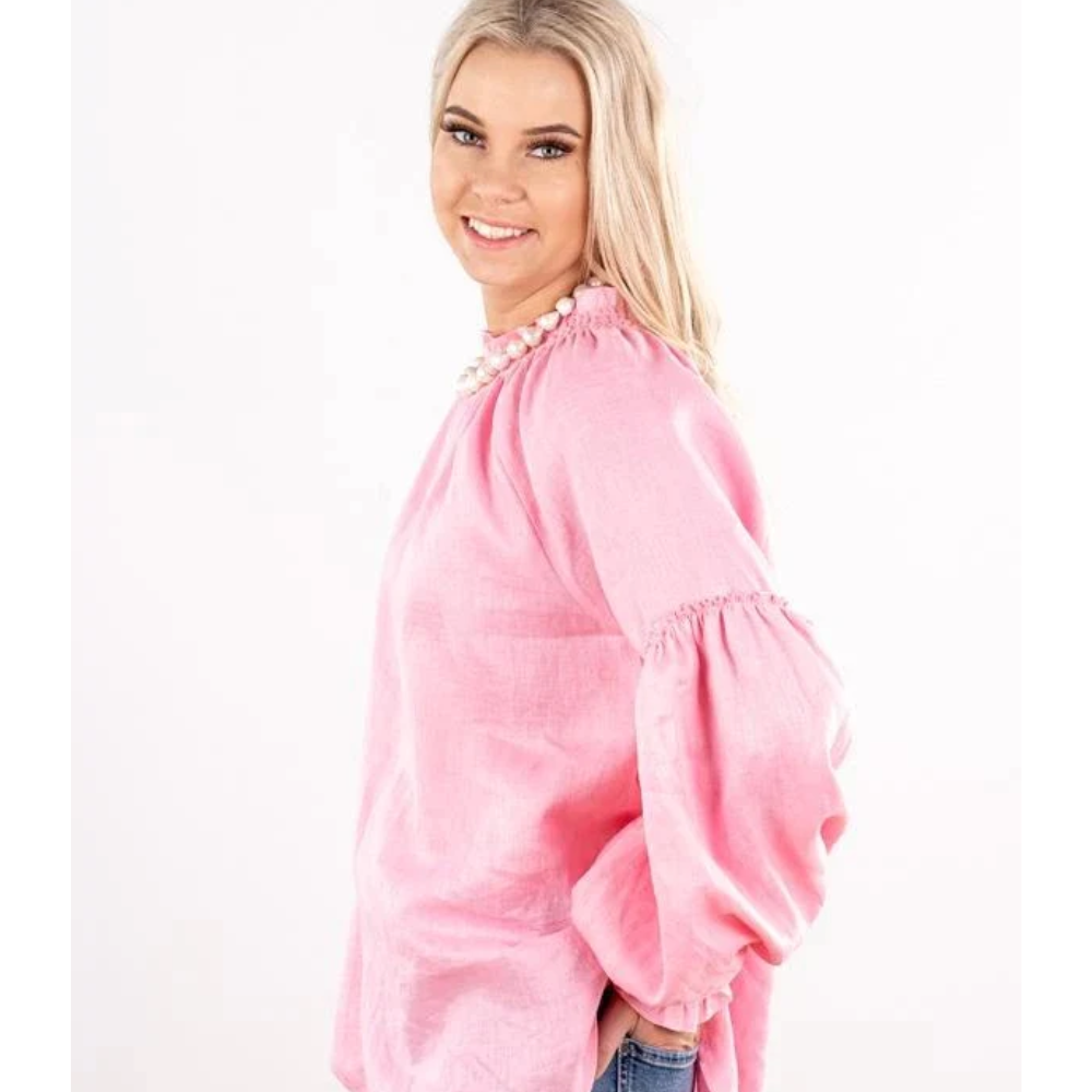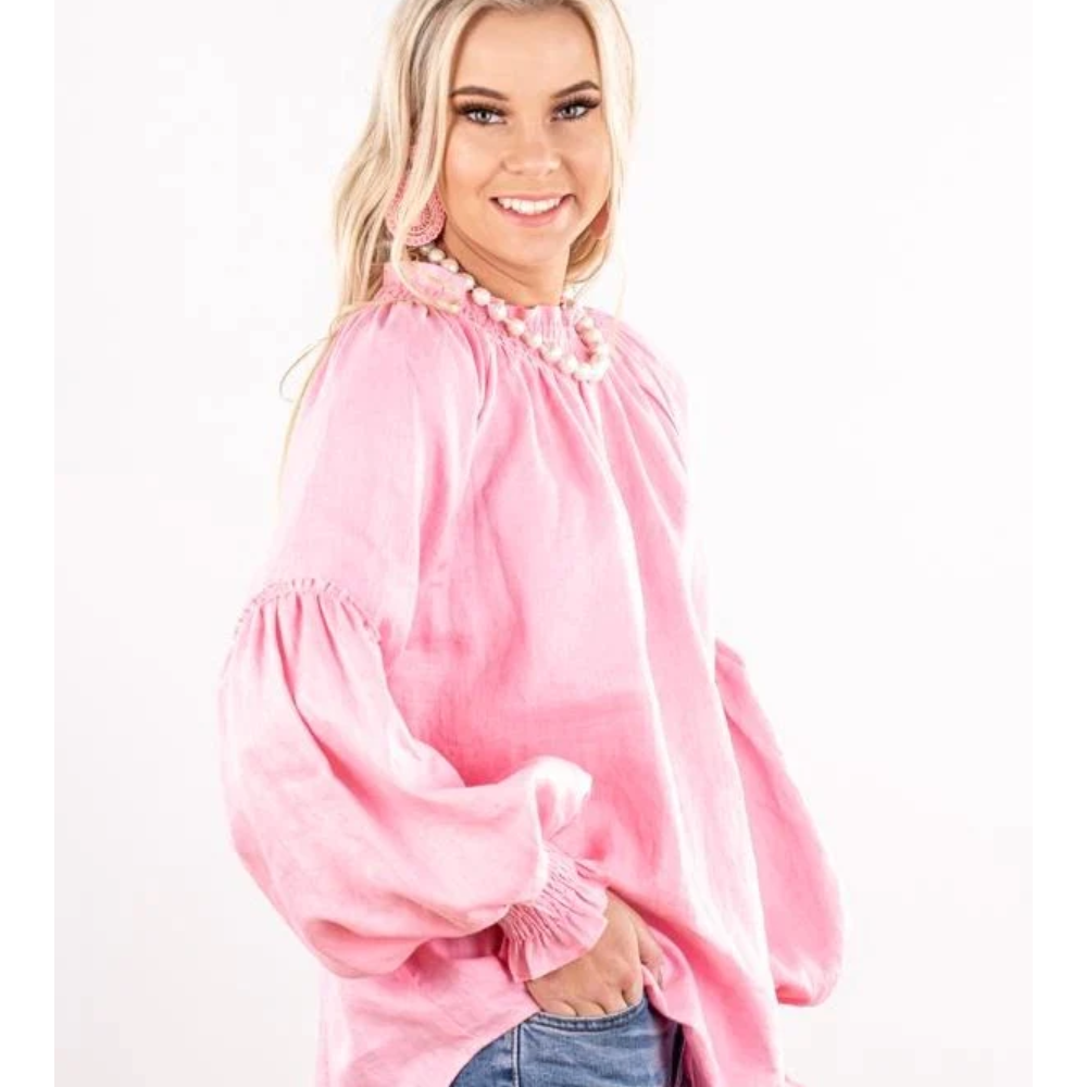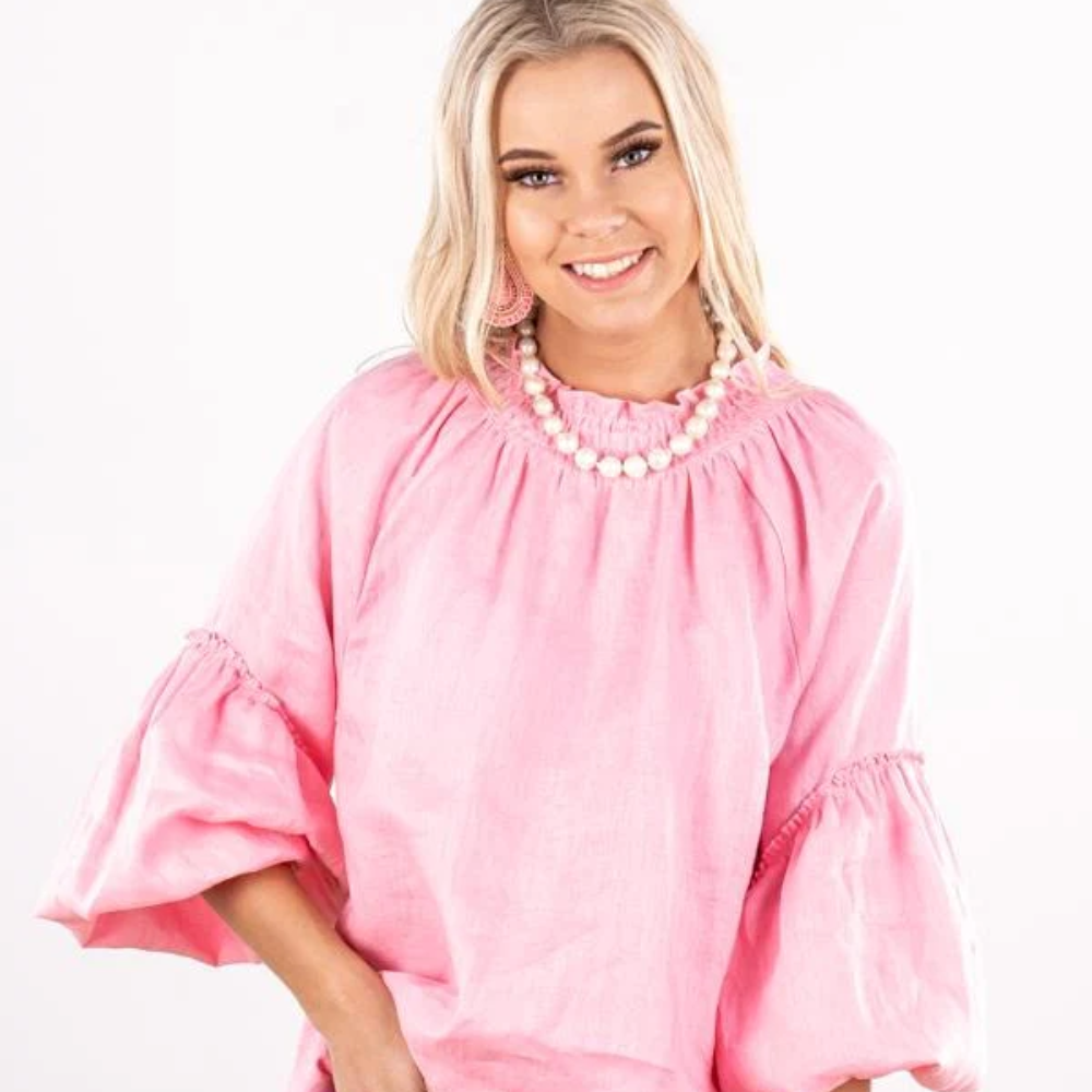 Tailored from a beautiful baby pink linen and featuring our gathered sleeve detail with plenty of volume, this top is the perfect go to for a trip to town, lunch or a coffee date. Longer line hem at the back, soft shirred elastic neckline and cuff. The sleeve is easily pushed up to shorten the length. This top is designed to be very loose fitting and flowing. The sizing for this garment is very generous. We recommend sizing down a complete size for this garment.