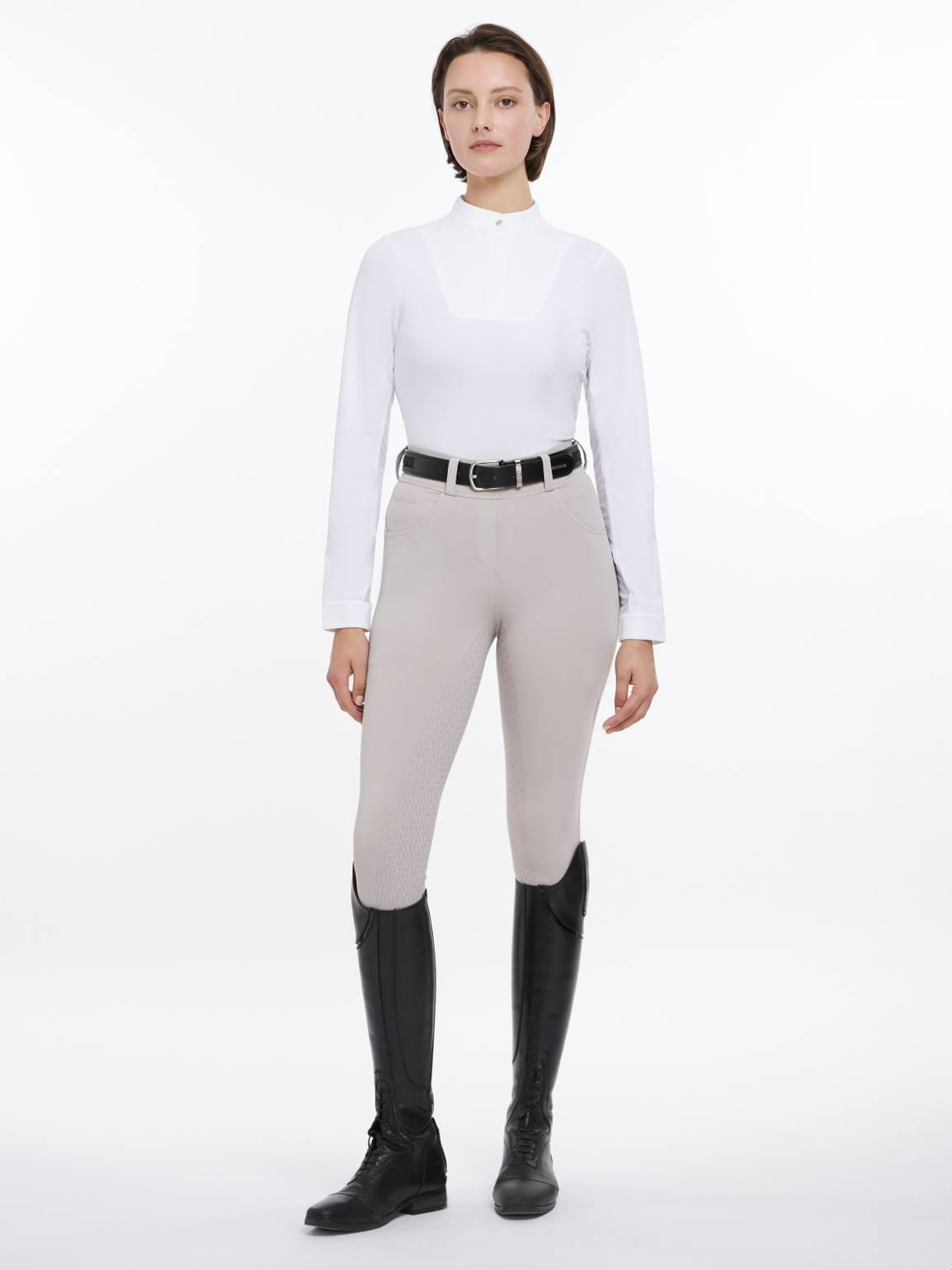 Belt loops on the waistband, side pockets and a faux fly front create the authentic 'breech' look. Choose your favourite colour and coordinate your entire horse riding wardrobe.