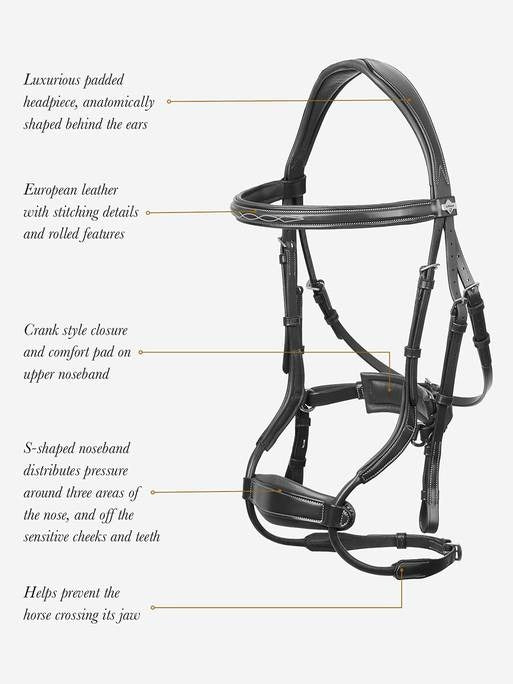 Expertly crafted bridlework in European leather with stitching details and rolled features, this groundbreaking bridle is designed to minimise pressure on the delicate areas of your horse's face.
