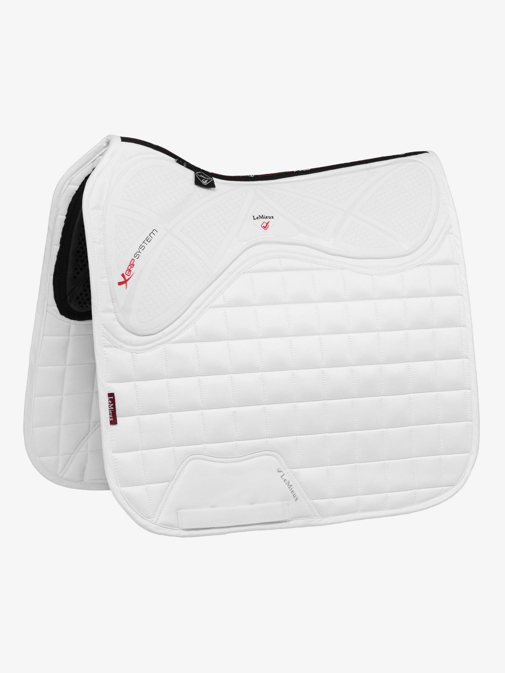 The Twin Sided X-Grip Dressage square combines the stylish, iconic LeMieux cut with the new X-Grip silicone & bespoke Acavallo Gel mould to provide the maximum saddle stability, shock absorbency and grip of any saddle pad! The unique 3 layer design combines the X-Grip silicone top side, Blast foam core & Acavallo gel underside to create one low profile highly effective pad. The lower density memory foam under the X-Grip silicone aids saddles to bed down and stabilise whist the bespoke X-Grip Acavallo gel underside has the same low profile, non-slip credentials as all Acavallo products. This twin sided technology makes this the most elite product in the LeMieux stable.