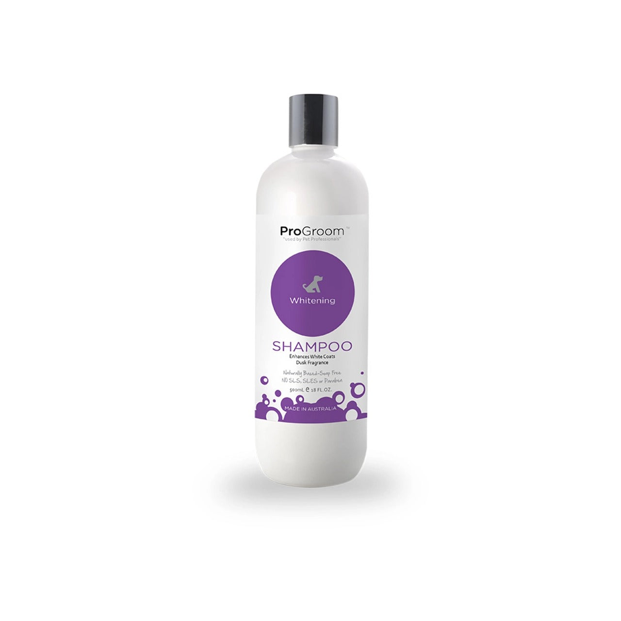 ProGroom™ Whitening shampoo enhances and brightens will make all coats have more true colors and luminosity. The gentle but deep cleaning formula is good for all coat types and will leave coats light and fluffy without overly softening.