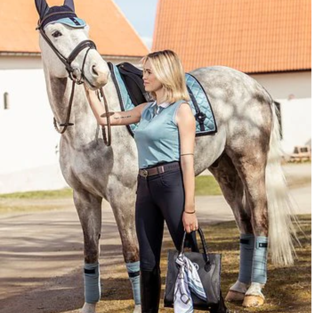 The ears are elastic and made of a stretchy, breathable, antimicrobial quick-dry material. The elastic fabric at the ears makes the fly hat fit all types of horses. It quickly transports moisture and sweat away during the whole ride. The fly hat has a classic, crocheted bottom, double piping, and the lower part of the fly hat is covered with shiny, dirt-repellent material.