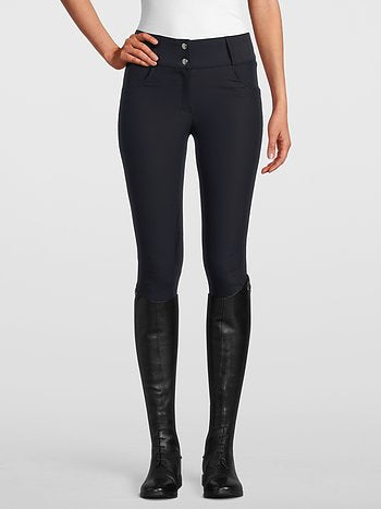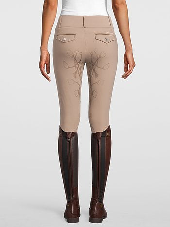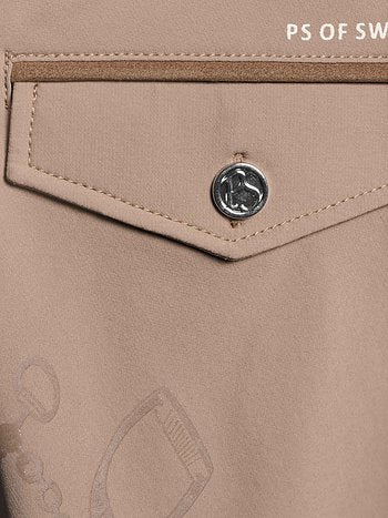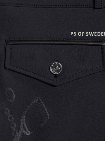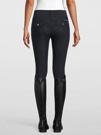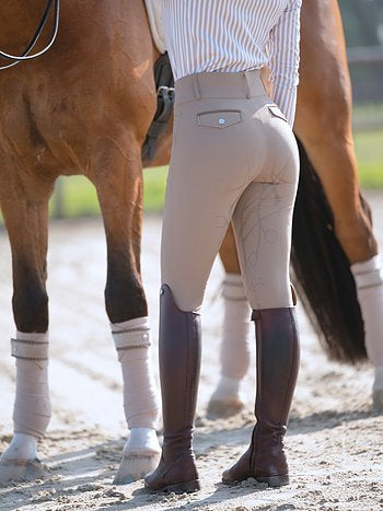 High-waisted, full grip riding breeches. The riding breeches are made of a 4-way-stretch material that breathes and provides optimal movability. The full seat silicon is luxurious and unique with a stirrup pattern. The pocket imitations in the back are strategically placed to not scratch the saddle. The riding breeches are elastic at the ankles.