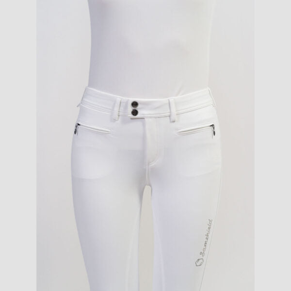 Based on Samshield's most popular breech, the Adele Boreal Breeches are made from high stretch, extra comfortable Italian fabric that provides a second skin feel for the rider with exceptional freedom of movement whilst a six layer grip provides excellent stability in the saddle. Body temperature regulating technology wicks moisture away and keeps the skin dry. The Swarovski crystal fabric on the rear pairs with the Samshield Swarovski logo on the leg and gives this garment a premium finish. These breeches are also EPD Certified, making them environmentally friendly. Additional features include a hidden phone pocket, compressive calf area for increased blood flow and muscle support and an inner elastic panel on the waistband to keep your shirt in place.