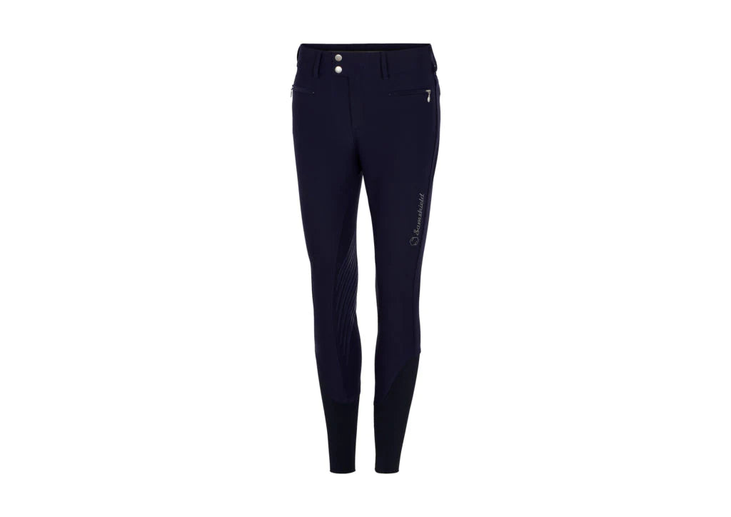 The Clotilde breeches offer a second skin effect for optimal comfort and fit. The elasticated fabric guarantees high breathability and wind protection. The silicone knee grip ensures stability and adherence in the saddle. A horizontal accordion panel across the lumbar area helps to eliminate gapping and the dreaded ride-down in the back as you go about your show day tasks. The compression fabric provides a flattering effect for the rider, while the elastic tape inside the belt is equipped with silicone which prevents the shirt from rising. Thanks to the special construction of the fabric the Clotilde breeches offer protection against ultraviolet rays and are finished off with a sock bottom that will effortlessly keep your breeches securely in place. The breeches also display front slash zipper pockets