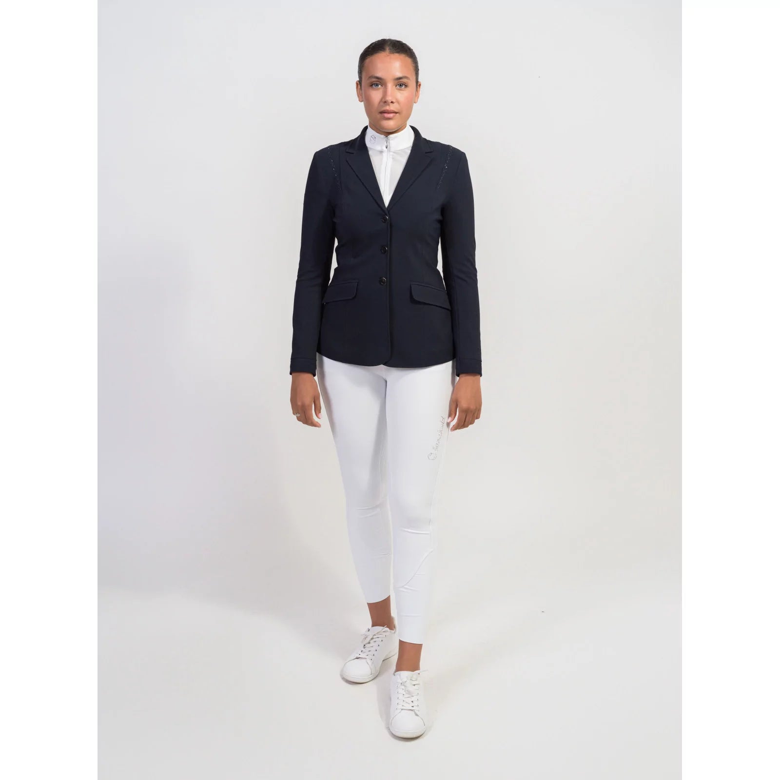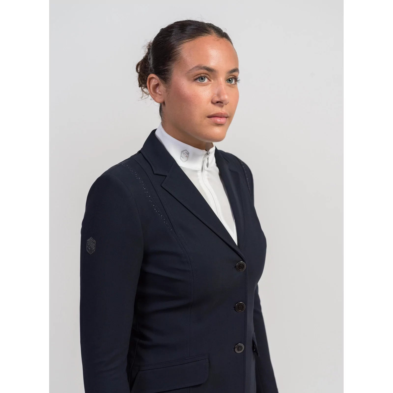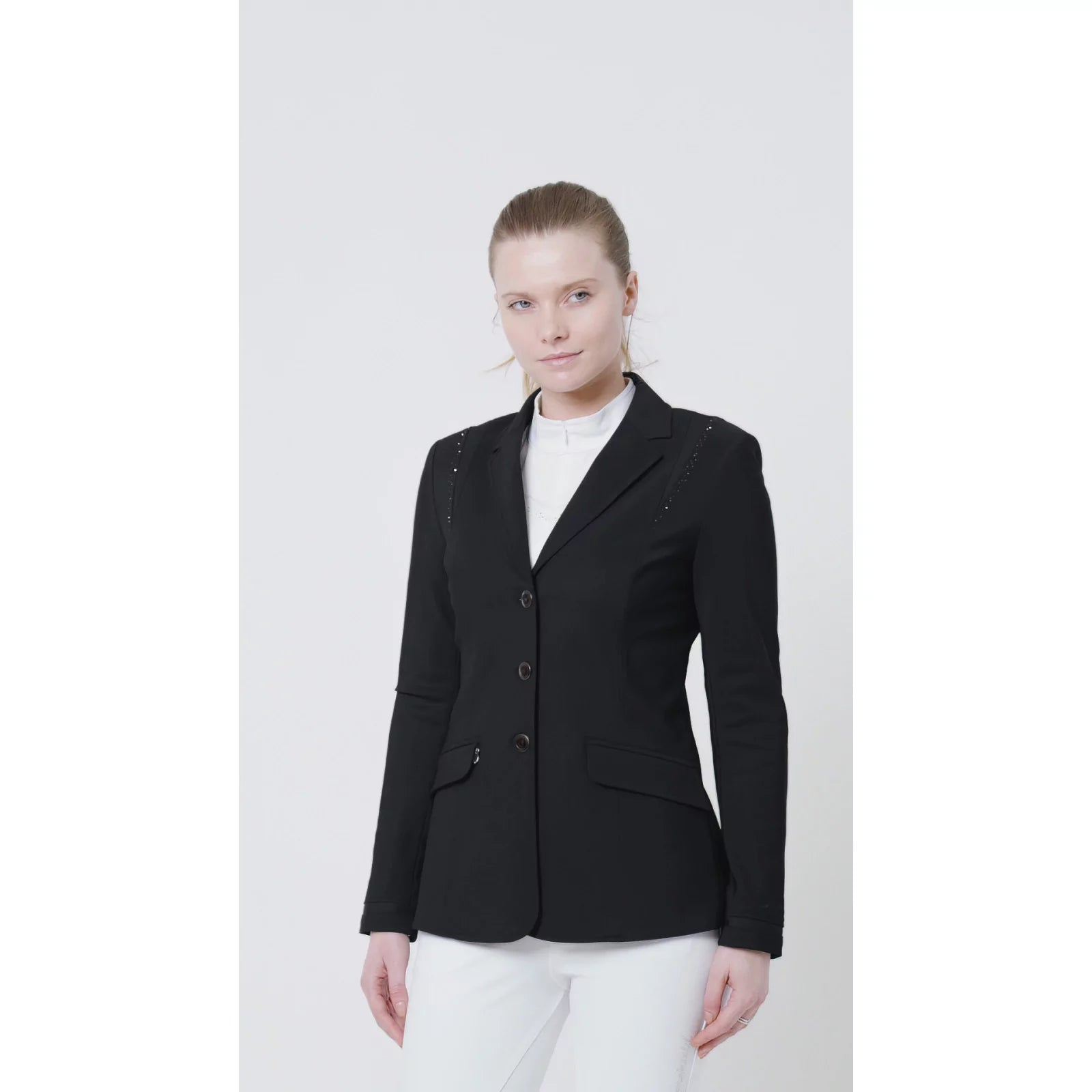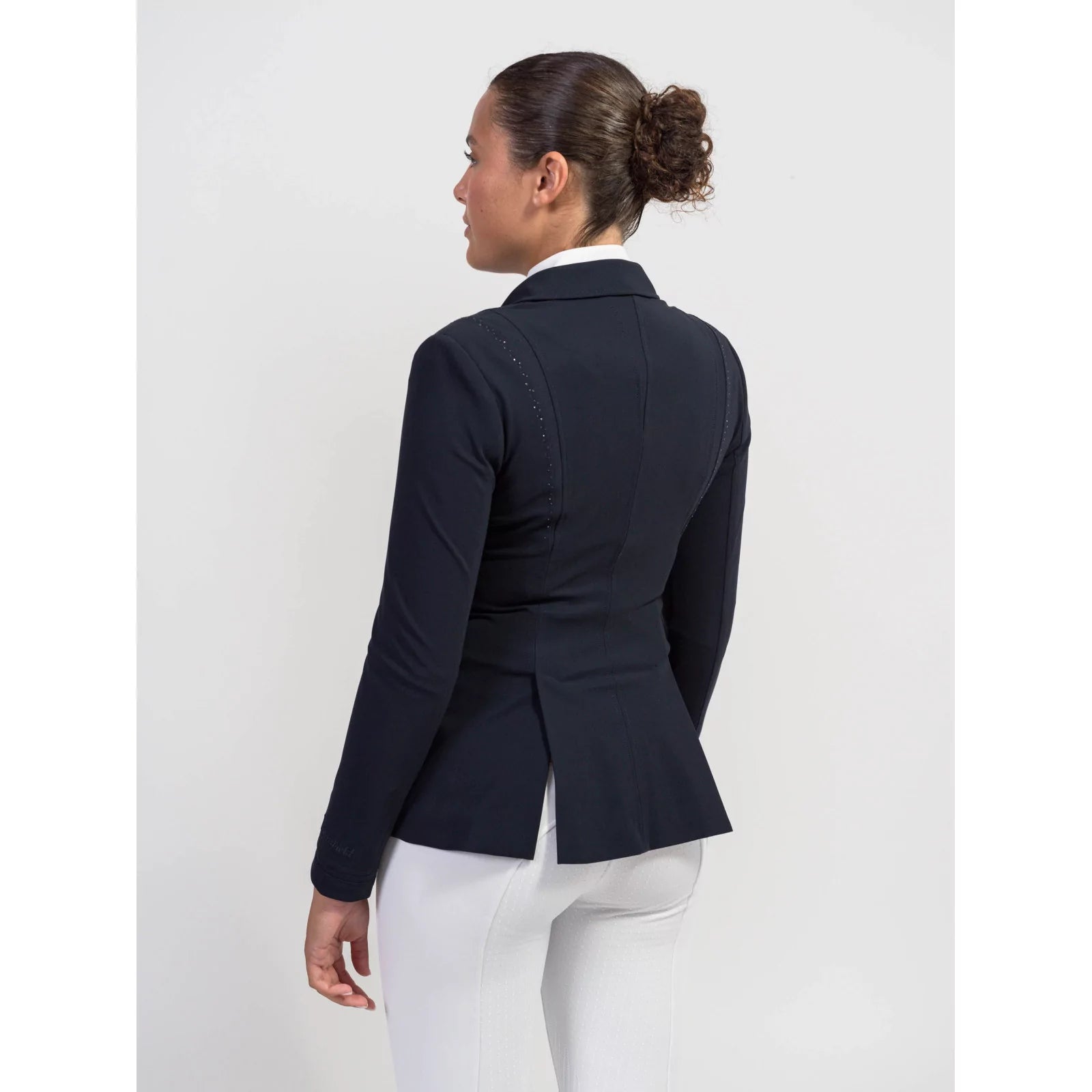 Designed on a longer base, the Deltalix Crystal Competition Jacket is perfect for taller riders. Embossed fabric panels across the back and shoulders give a stylish and sporty feel to this jacket, whilst the Swarovski Crystal & metal dot décor complete the design. Mesh lined for breathability, with four way stretch fabric for unparalleled rider comfort and performance.
