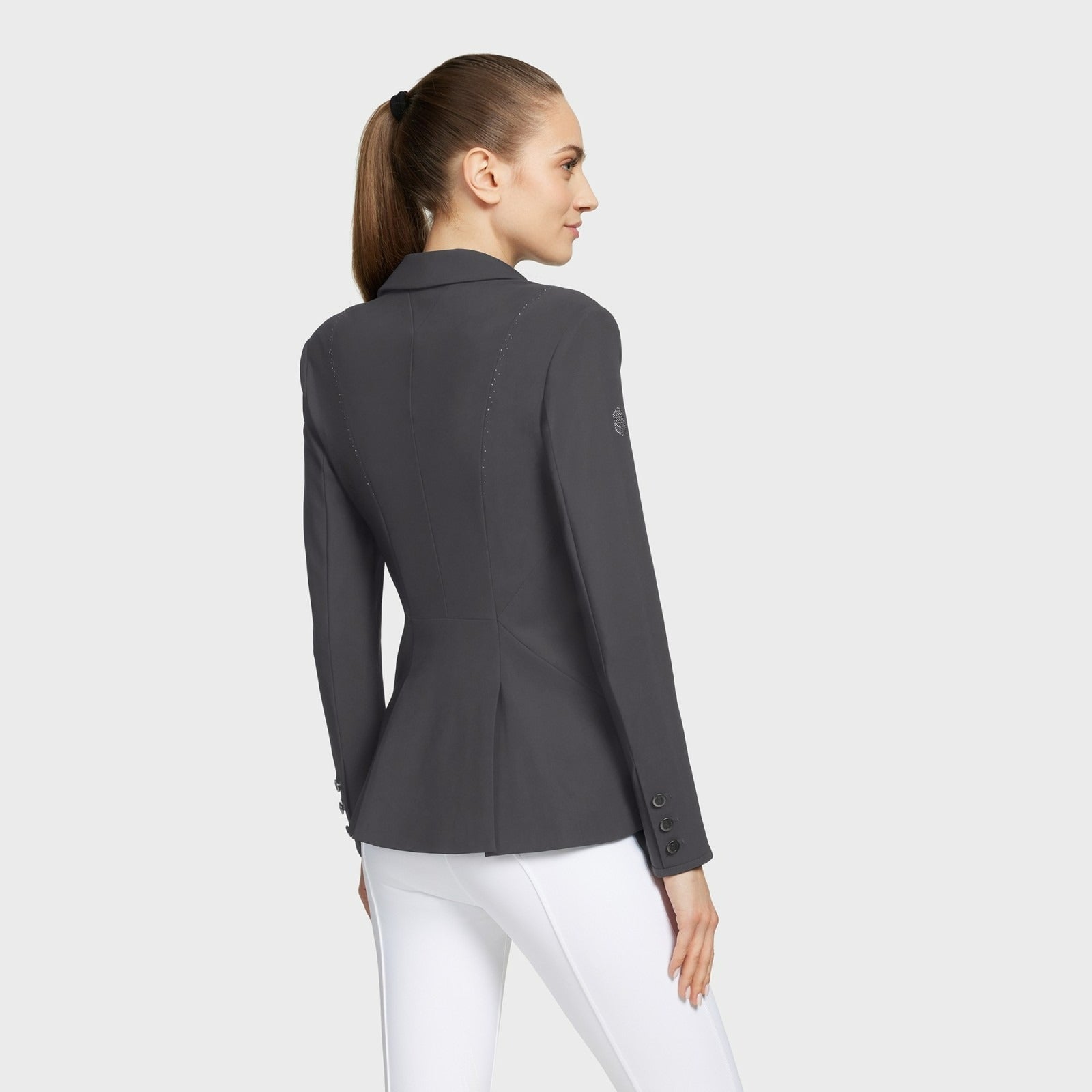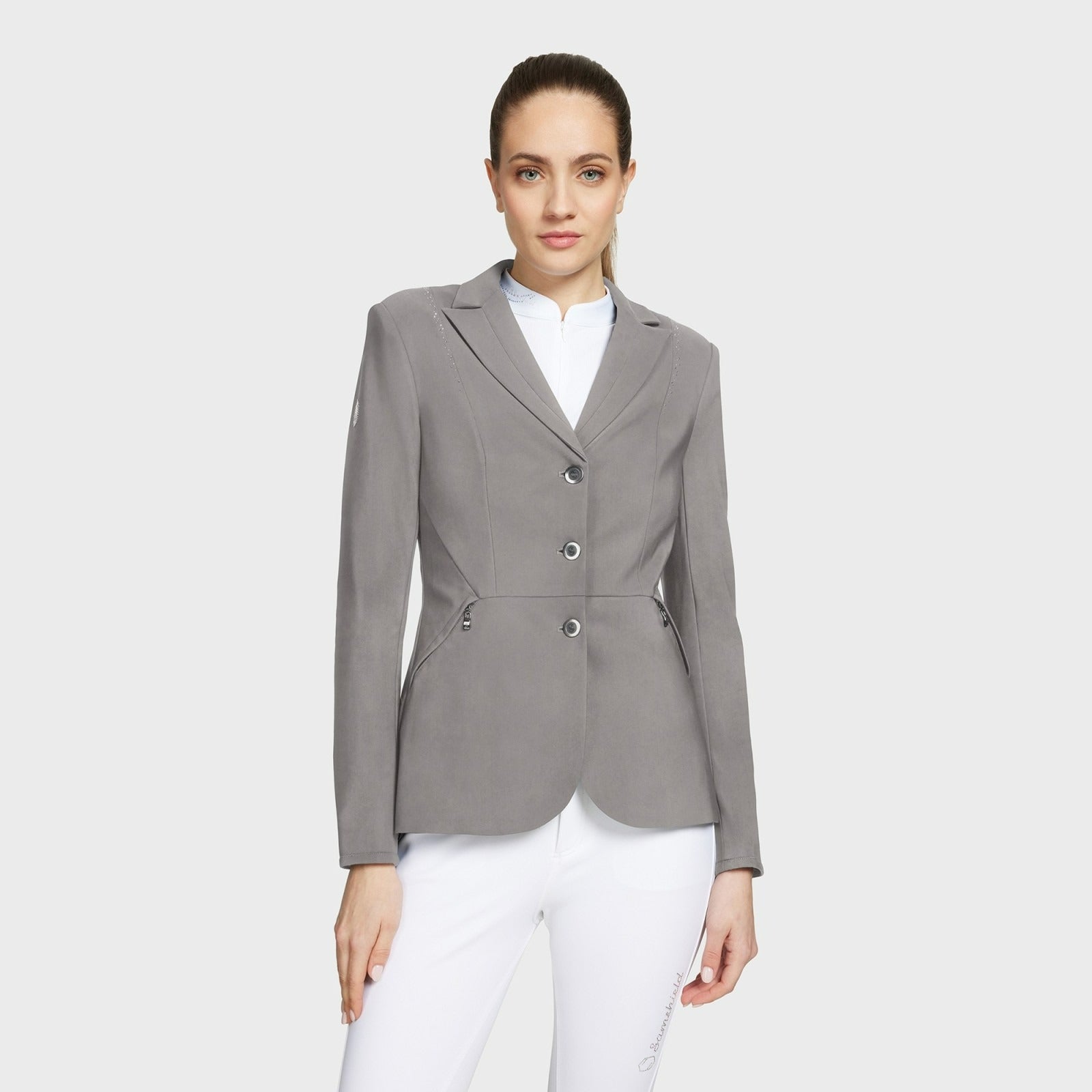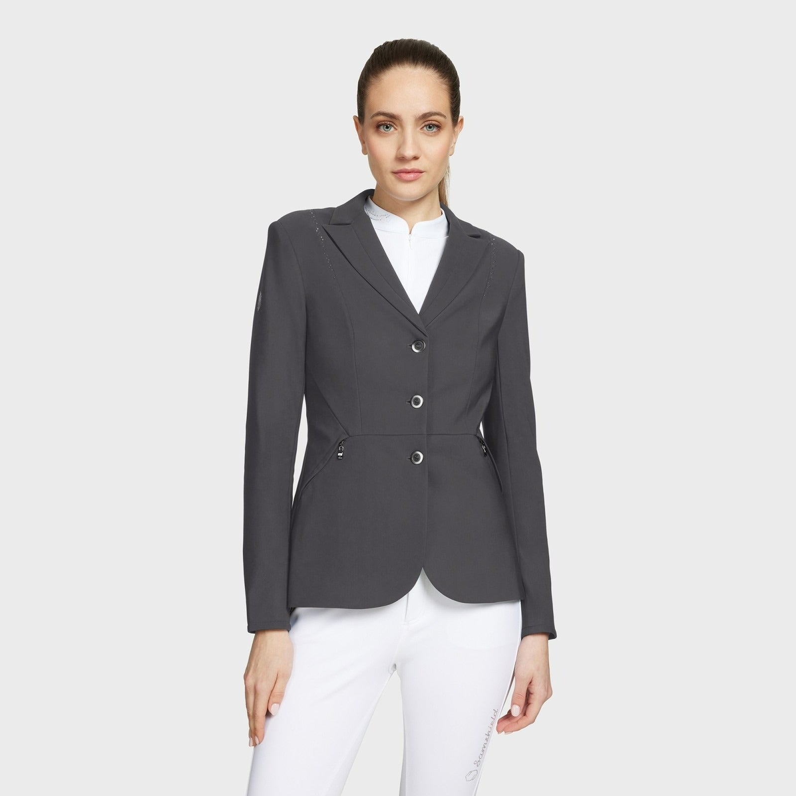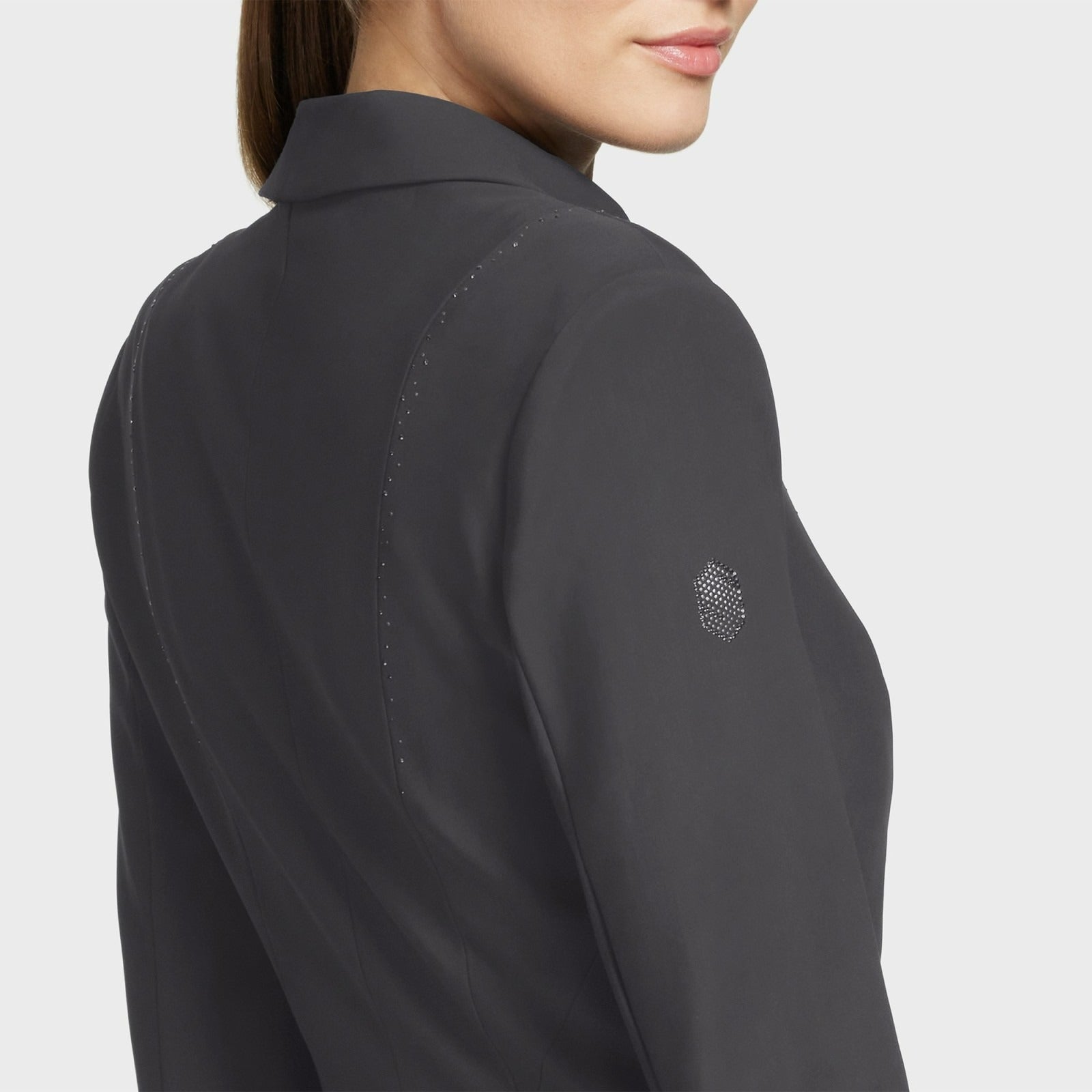 The Samshield Jackie Crystal Jacket offers a sophisticated style, with delicate tailoring for the perfect fit. A precise scattering of Swarovski crystals and metal dots down the chest, a subtle logo on the arm, and black chrome buttons make for an elegant and timeless design. High-quality, texturised fabric throughout provides extra comfort and breathability for the rider. Helite Airbag compatible. Easy care, machine washable at 30'. Composition: 73% PA 27% EA