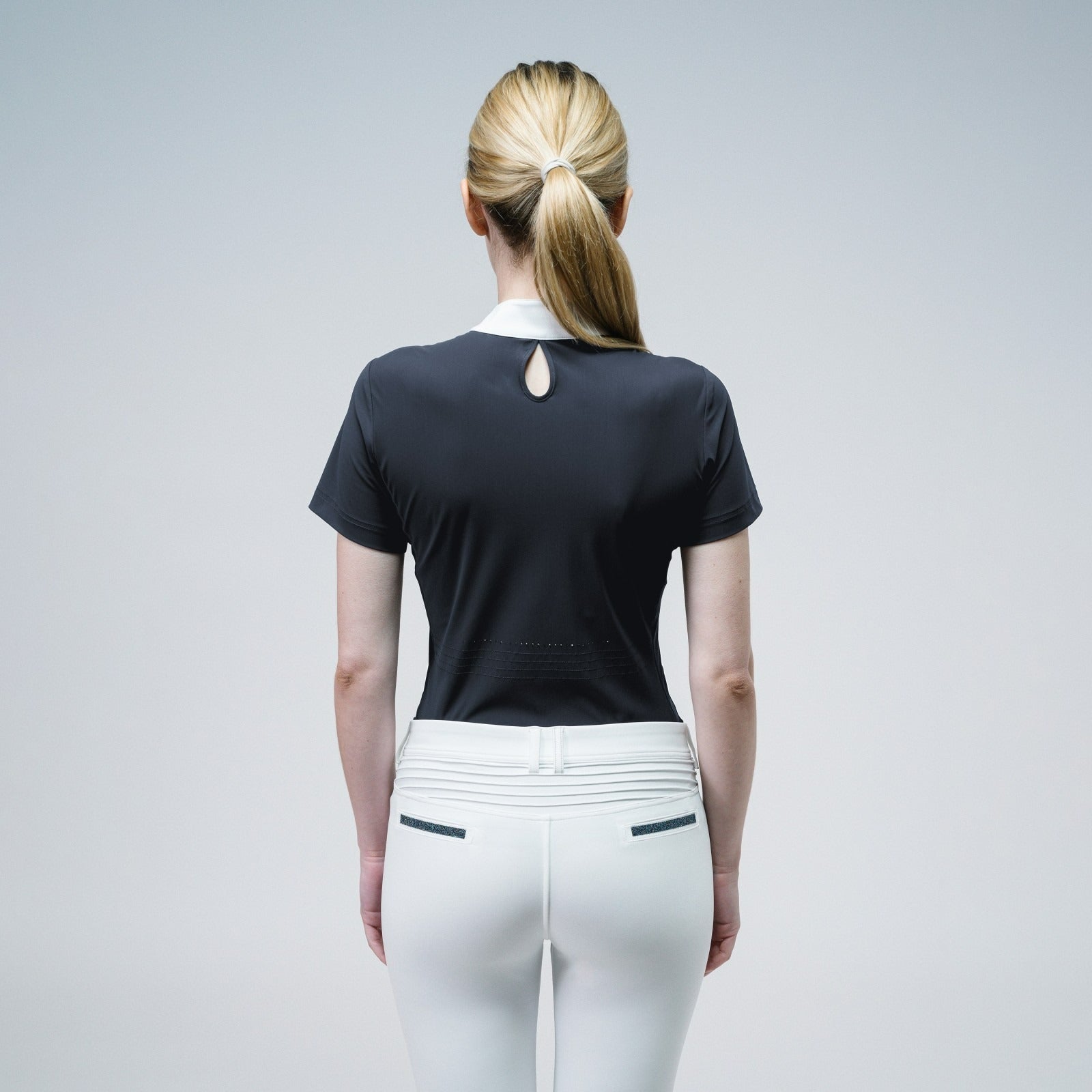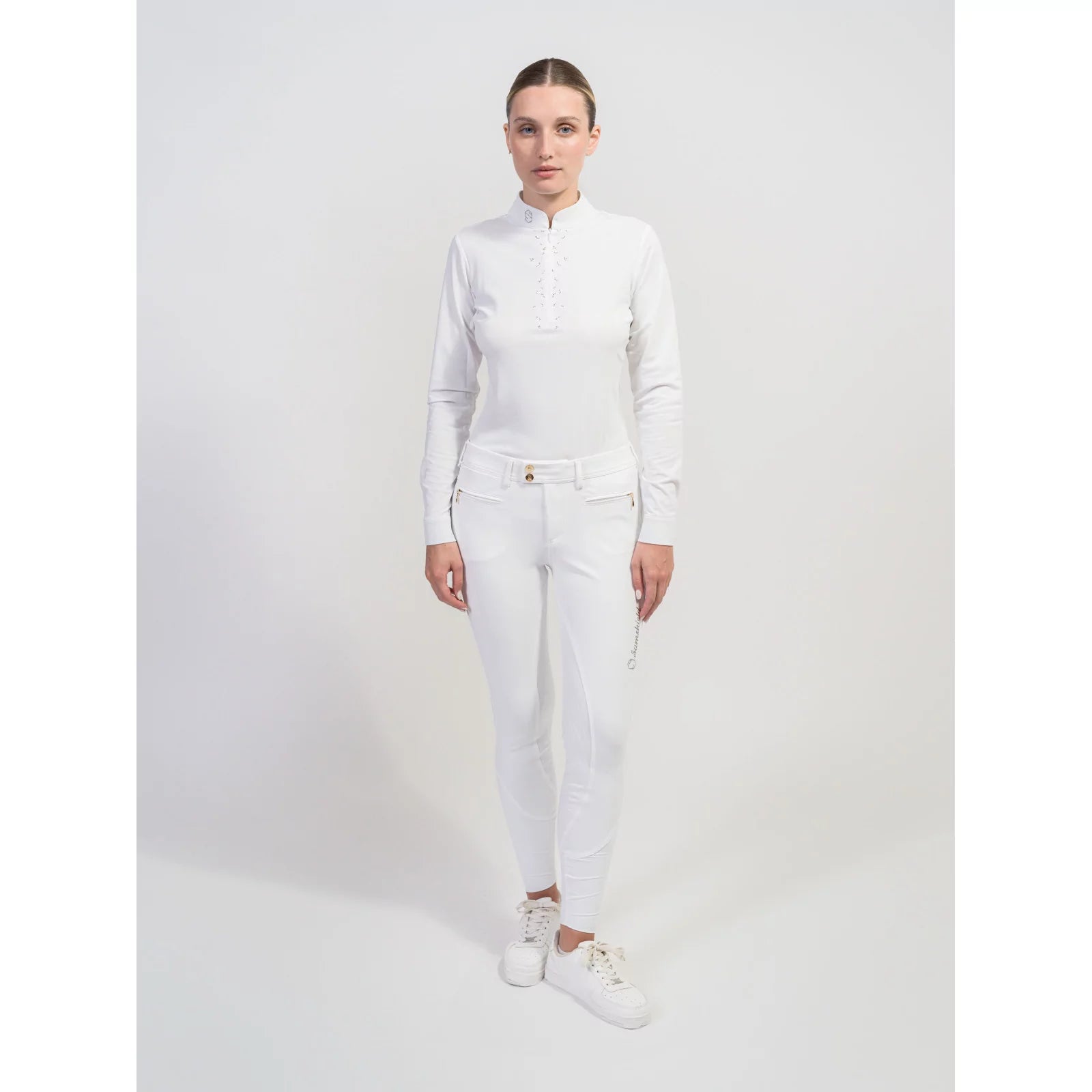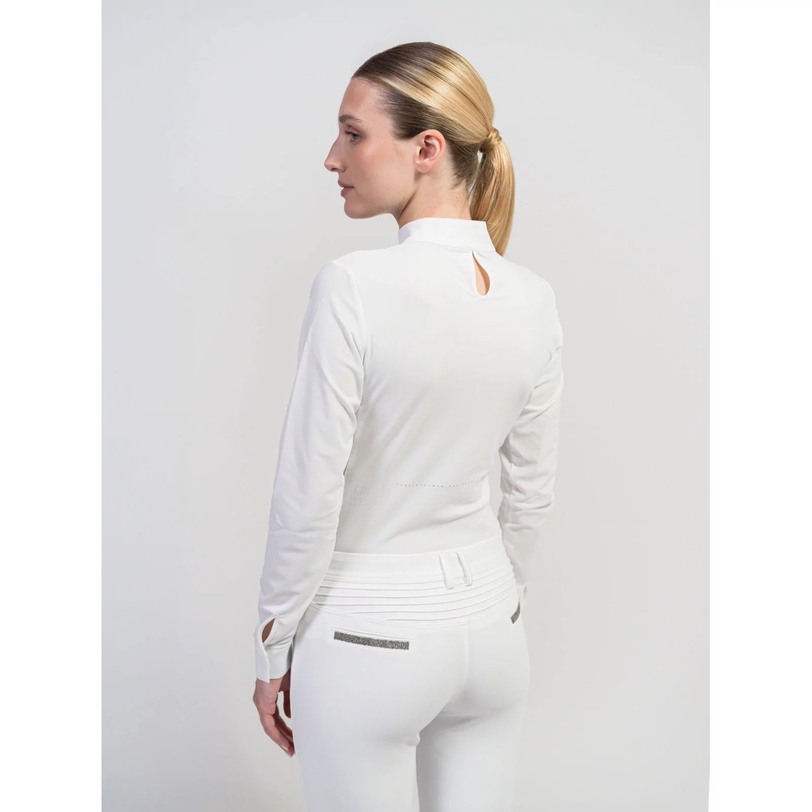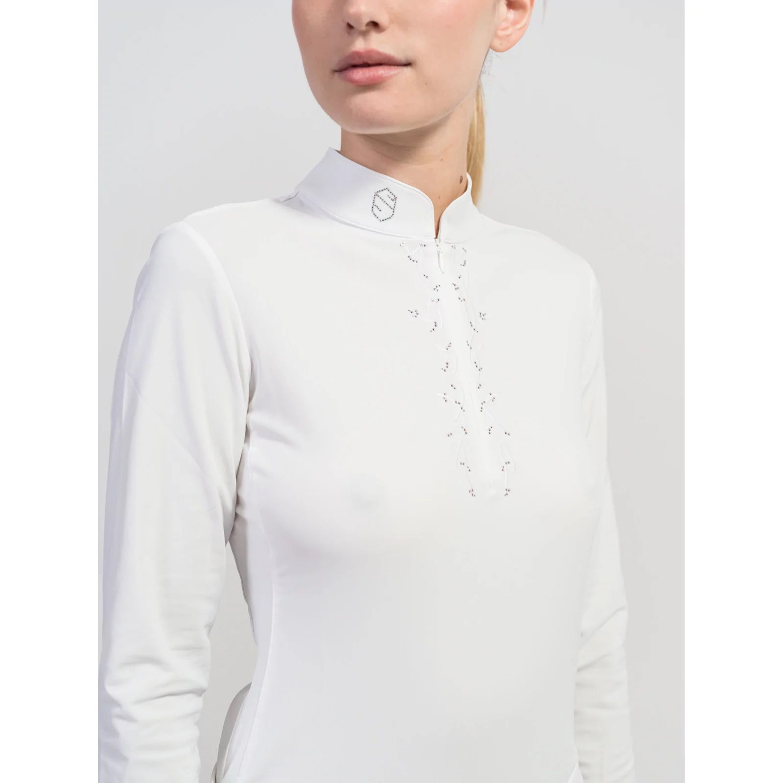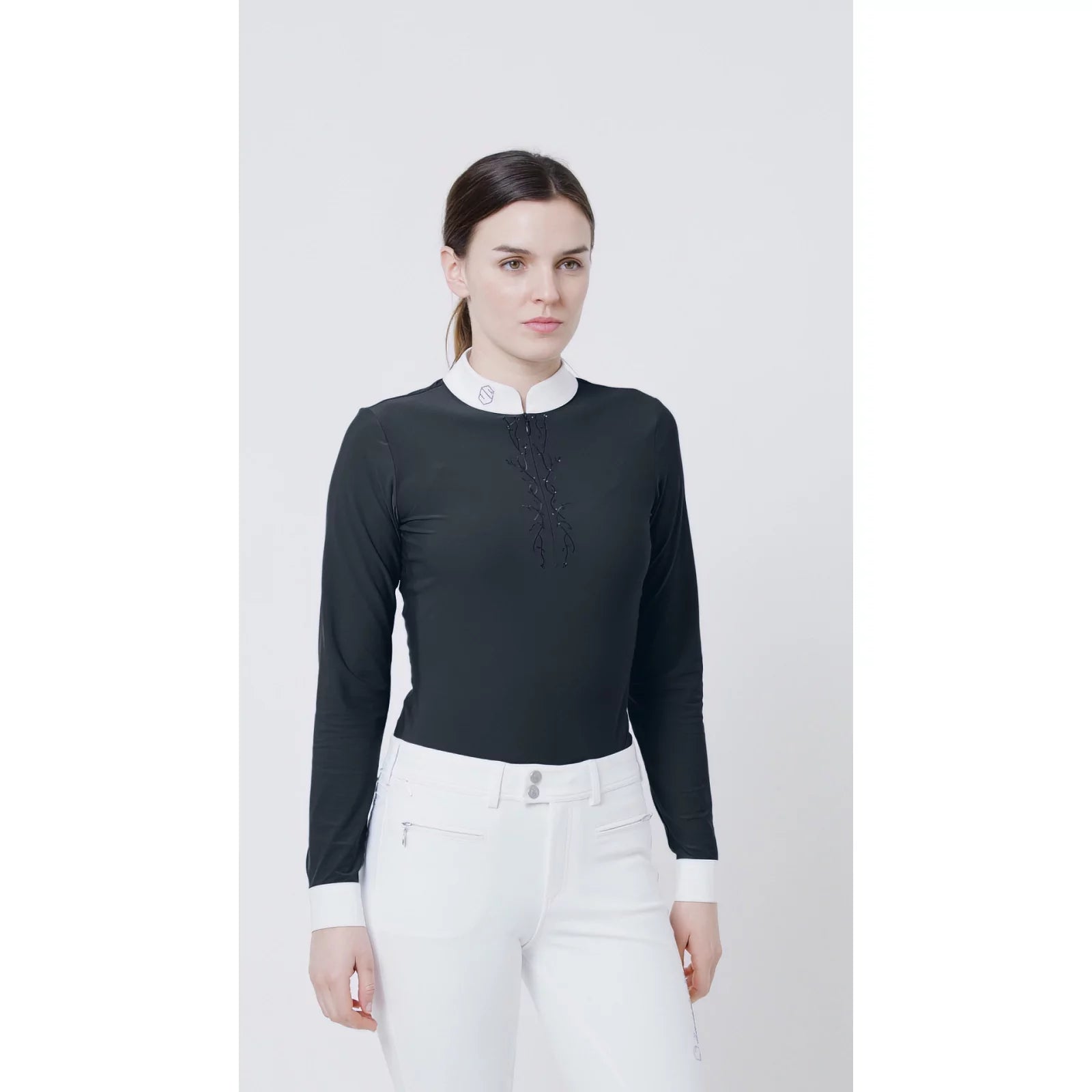 The Samshield Loise Crystal Long Sleeve Shirt embodies a striking blend of elegance and functionality within the realm of equestrian attire. Crafted from premium technical fabric, the Loise Crystal shirt offers exceptional breathability, stretch, and moisture-wicking properties, ensuring supreme comfort during rides. Its innovative composition maintains a lightweight feel while exuding a polished appearance. The shirt is adorned with intricate crystal embellishments inspired by cherry blossom that lend a touch of glamour, alongside discreet logo detailing, an invisible zipper, and a refined collar, all contributing to its refined aesthetic. With its harmonious fusion of modern performance and timeless sophistication, the Samshield Loise Crystal Long Sleeve Shirt is an alluring choice for riders seeking a distinctive and refined wardrobe staple that effortlessly complements their equestrian and daily ensembles.