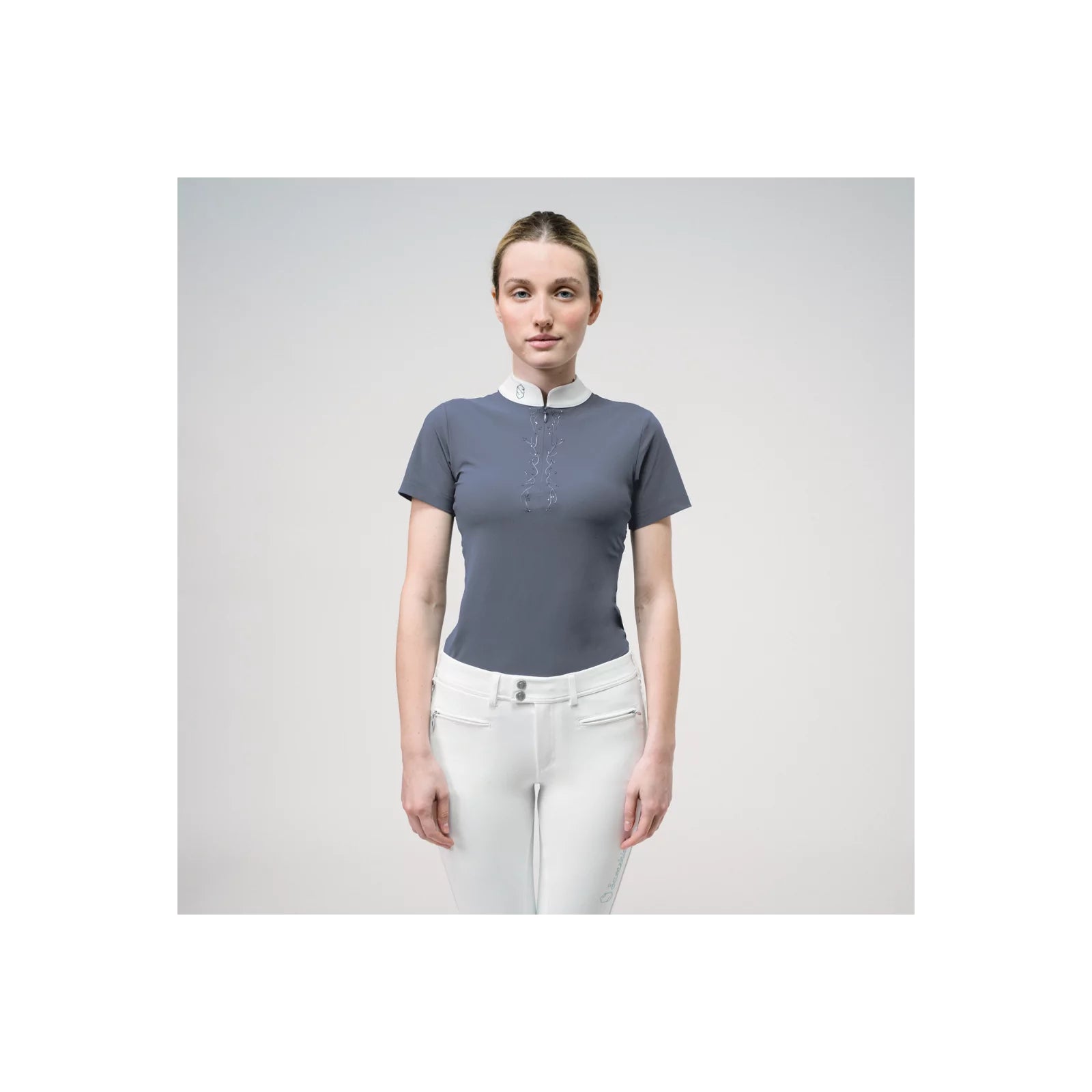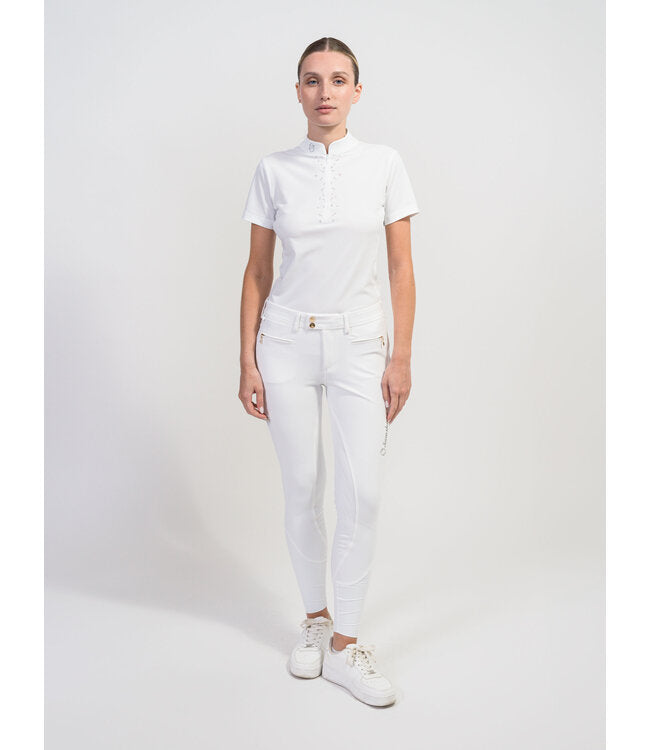 The Samshield Loise Crystal Short Sleeve Shirt embodies a striking blend of elegance and functionality within the realm of equestrian attire. Crafted from premium technical fabric, the Loise Crystal shirt offers exceptional breathability, stretch, and moisture-wicking properties, ensuring supreme comfort during rides. Its innovative composition maintains a lightweight feel while exuding a polished appearance. The shirt is adorned with intricate crystal embellishments inspired by cherry blossom that lend a touch of glamour, alongside discreet logo detailing, an invisible zipper, and a refined collar, all contributing to its refined aesthetic. With its harmonious fusion of modern performance and timeless sophistication, the Samshield Loise Crystal Short Sleeve Shirt is an alluring choice for riders seeking a distinctive and refined wardrobe staple that effortlessly complements their equestrian and daily ensembles.