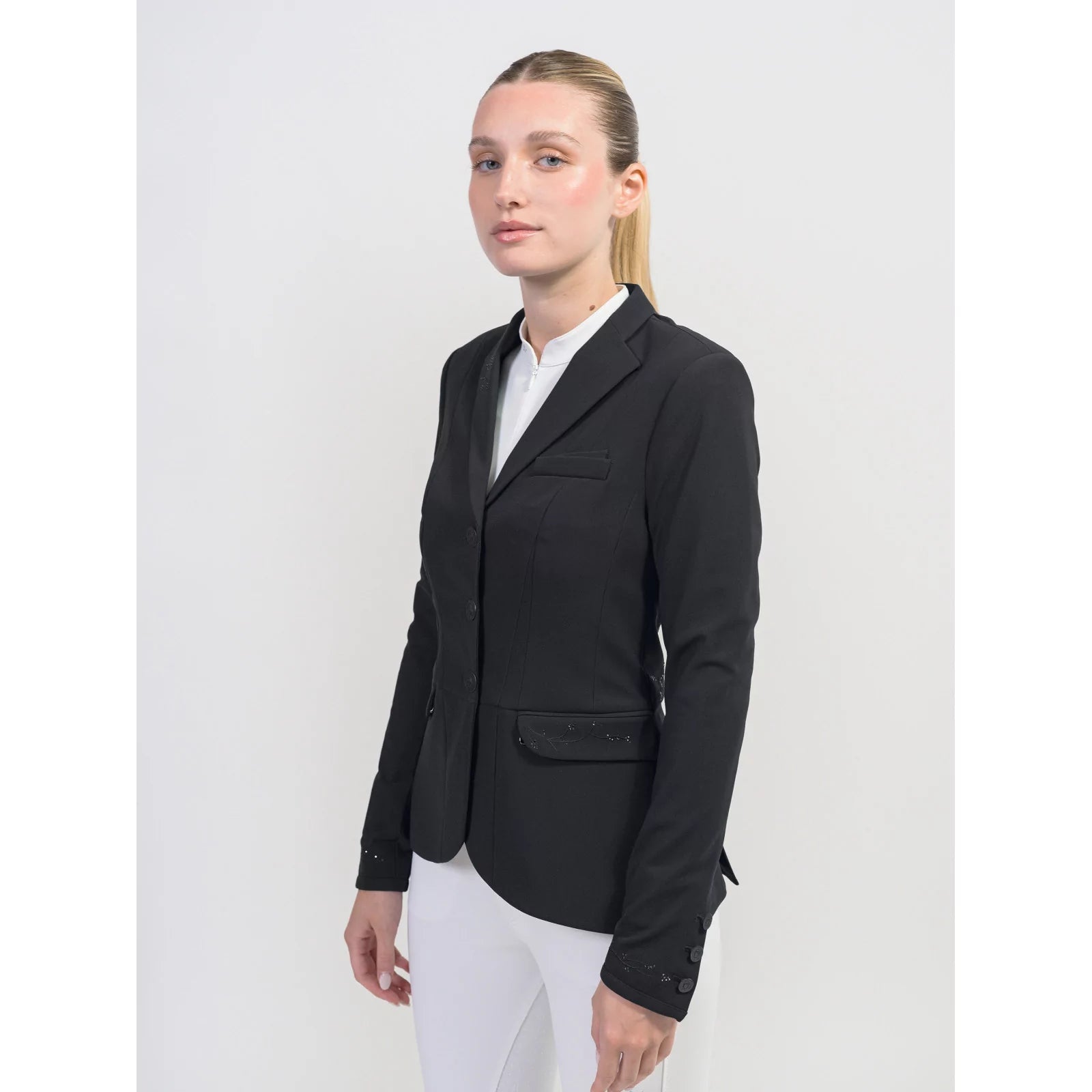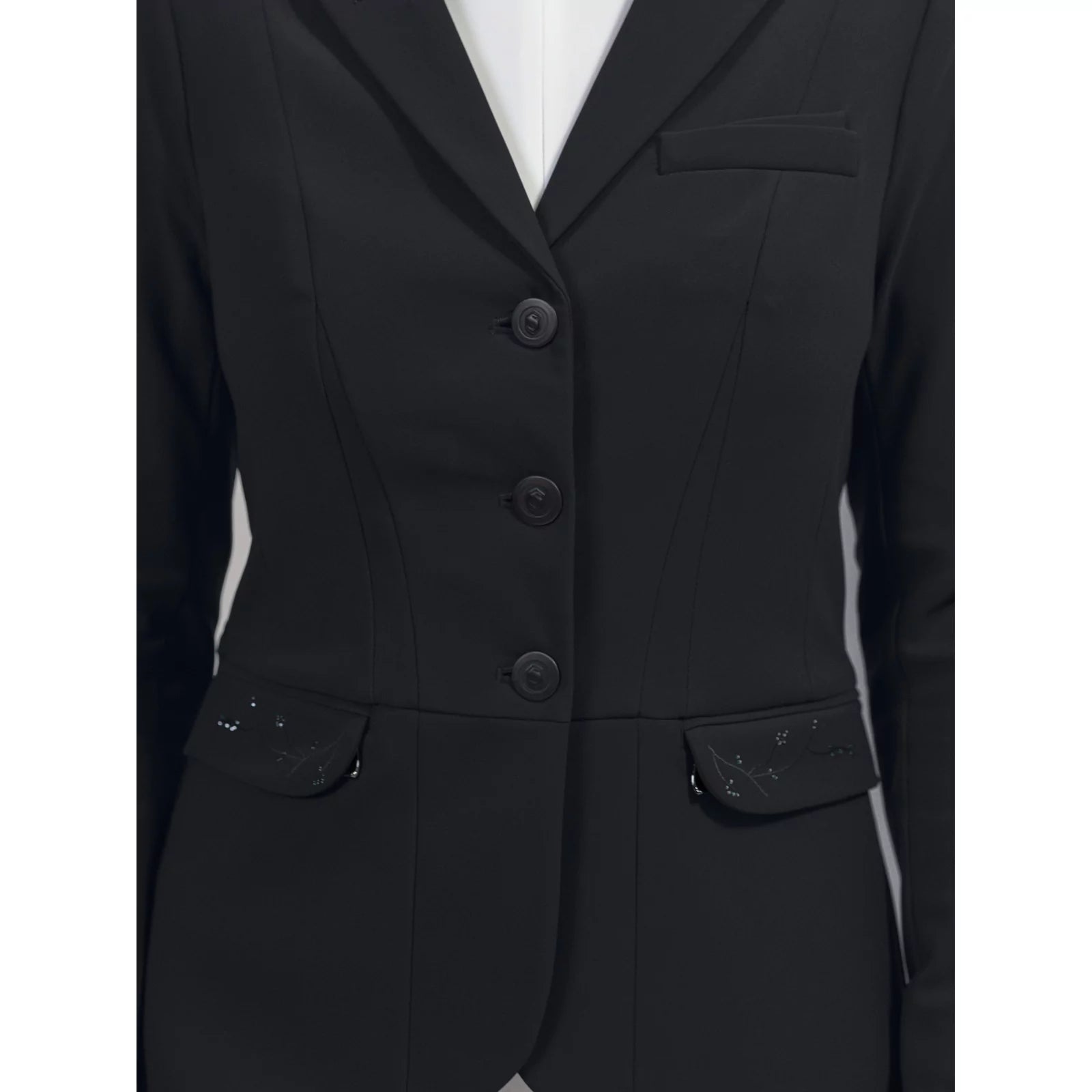 Inspired by cherry blossom, Victory Crystal Leaf brings style and elegance in one stunning jacket. Cut shorter at the front with a fan finish to the back, this asymmetrical cut adds comfort and style, whilst a hidden zipper closure behind the buttons enhances the fit. It's also easy care, machine washable at 30'C and is made with EPD Certification, making it environmentally friendly. Helite Airbag compatible.